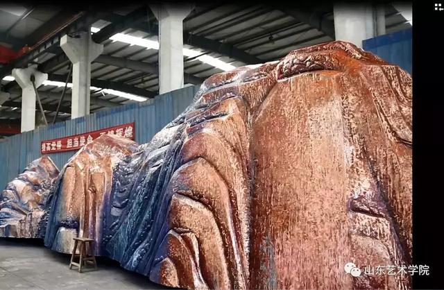山体造型全部采用手工捶打,通过手工艺术的温度展现山东人民坚韧朴实的性格以及精益求精的“大国工匠”精神。山体表面艺术处理以唐宋时期中国画青碧山水的色系神韵为本,彰显“绿水青山就是金山银山”的时代意义。一锤一锤手工敲制的肌理结合紫铜的金属质感,将山东人民对祖国的美好祝愿凝聚其中,漆艺特种髹饰工艺的磨漆、彩绘、金属箔等综合艺术手法,创新性地呈现出旭日东升之时流光溢彩的美好意象:朝阳之下,“国泰民安”的主题熠熠生辉,晨雾蒸腾,青山绿树,光影斑斓璀璨……通过对自然美好意象的表现,表达对盛世祥和、国泰民安的赞颂。