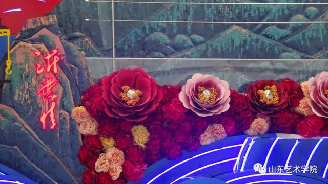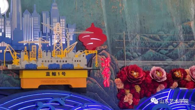 车体前端牡丹花群渲染“花开盛世”的美好祝愿,采用数码编程设计出动态开合装置,花簇在行进中缓慢绽放,寓意着山东人民幸福祥和的生活和对新时代的赞美与讴歌。我校舞蹈学院12名学生分为三组进行《沂蒙情颂,盛世华章》的舞蹈表演,以舞蹈艺术的形式表现了沂蒙精神在新时代的传承与发扬:车头6名学生的舞蹈组合以典型性的舞蹈动态和服饰妆容塑造“沂蒙六姐妹”的沂蒙情颂;中段4名学生以海浪的造型和热烈而端庄的表演,烘托盛世华典的气氛;后端2名学生演绎“牡丹仙子”的华贵高雅、花开盛世。