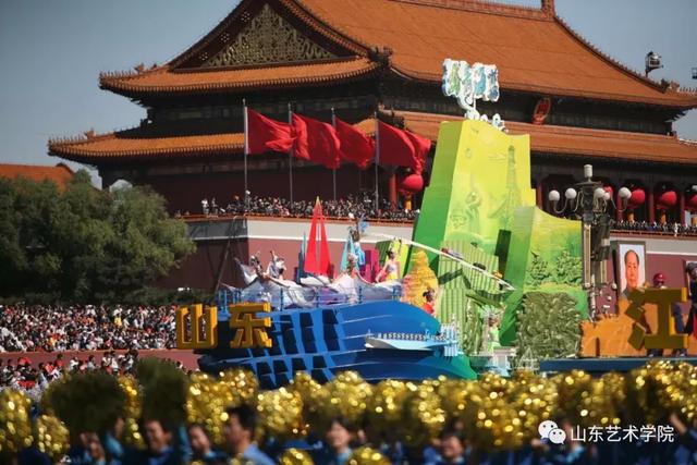 秋水长天,盛世欢歌,壮丽70年,阔步新时代。 10月1日上午,由中共山东省委办公厅承制,山东艺术学院承担设计、主要制作、彩饰和展演的山东彩车“国泰民安”,在首都北京天安门广场盛大的群众游行和精彩的联欢活动中隆重登场。