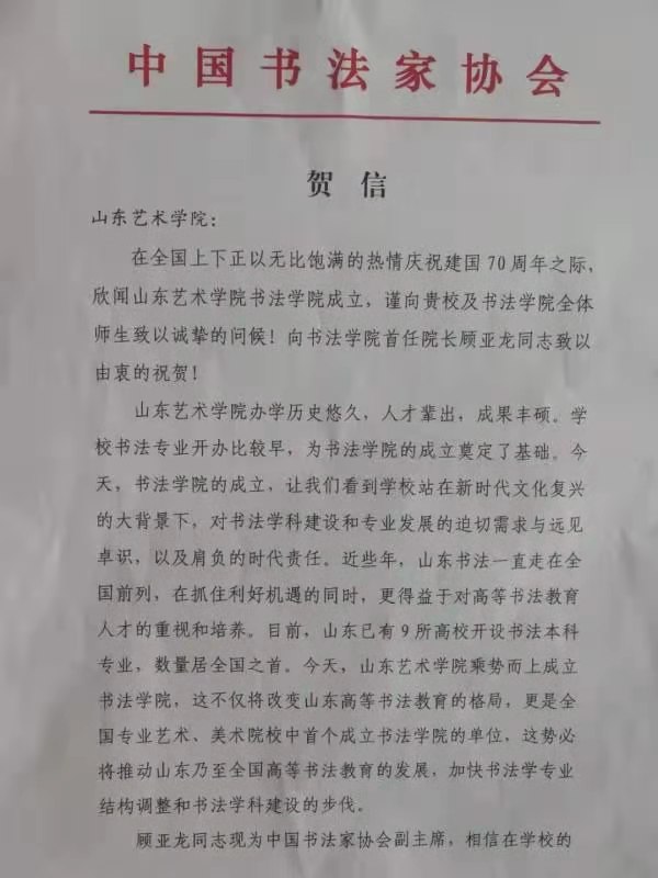 仪式上,山东艺术学院院长王力克指出,成立书法学院是学校契合时代社会发展、推动中华优秀传统文化传承创新的责任担当。高等教育的发展,高等艺术院校的发展,离不开对时代主题的把握,对社会需求的回应,对责任使命的担当。书法艺术是最具经典标志的民族文化符号之一,是中华优秀传统文化艺术的重要代表。山艺具有丰富的人才和资源优势,具有高水平的创作研究能力,理应承担起推动书法艺术传承创新的时代使命。他强调,经过16年发展,山东艺术学院书法专业不断发展壮大,取得累累硕果,初步形成了自身独特的教学风格,建立了较为科学完整的教学体系,在省内同类专业中有较大的影响。书法学院的成立将为书法学科专业发展提供更广阔的平台,汇聚更优质的资源,注入更生动的活力。