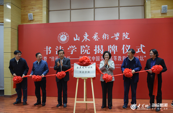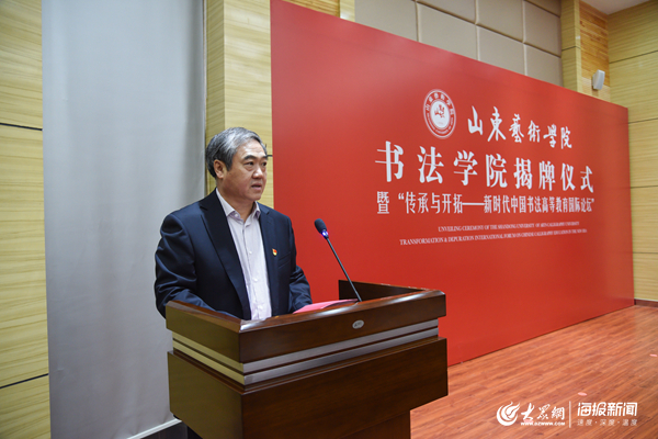 大众网教育·海报新闻讯(通讯员 王志军 王谦 王立燕 张顺智)10月19日,山东艺术学院书法学院揭牌仪式暨“传承与开拓——新时代中国书法高等教育国际论坛”开幕式在山东艺术学院长清校区举行。全国政协常委、中国书法家协会主席苏士澍,山东省政协副主席、党组副书记吴翠云,山东省委宣传部副部长程守田,中国书法家协会副主席、教育委员会主任翟万益,山东省文联党组书记王世农,山东艺术学院院长王力克共同为山东艺术学院书法学院揭牌,中国书法家协会分党组副书记、秘书长郑晓华宣读中国书法家协会贺信。揭牌仪式由山东艺术学院党委书记马东骅主持。