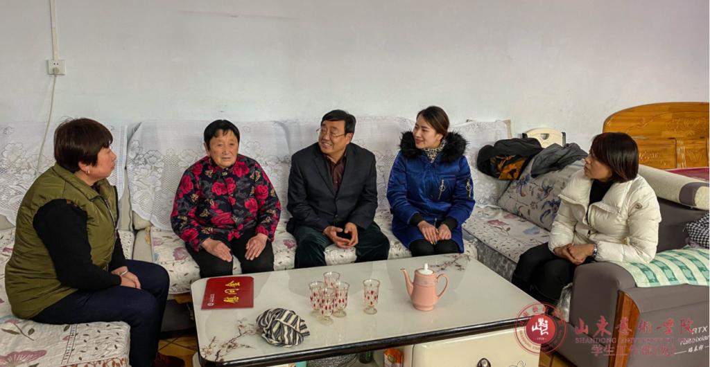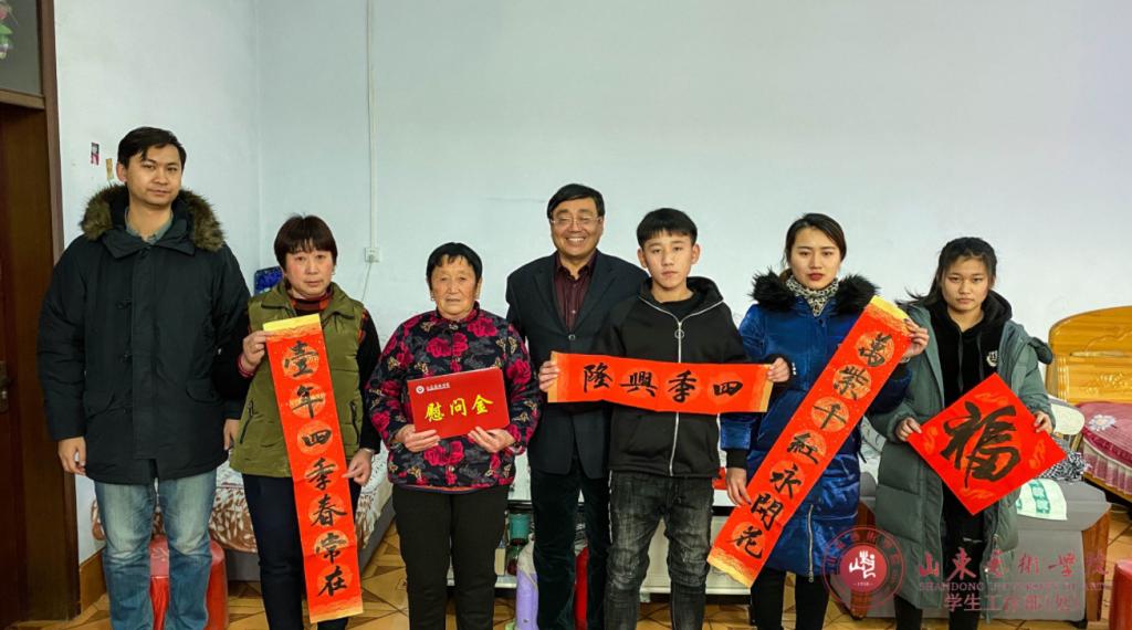 1月11日、12日,学校党委副书记孔祥华带领学生处和相关二级学院负责人到德州市平原县大胥村、临邑县田口村,淄博市淄川区南韩村、博山区窝疃社区,走访了戏剧学院、现代音乐学院、设计学院、艺术管理学院的部分家庭经济困难学生,给他们送去了慰问金、春联和大米、食用油等慰问品,向他们致以新春的祝福。