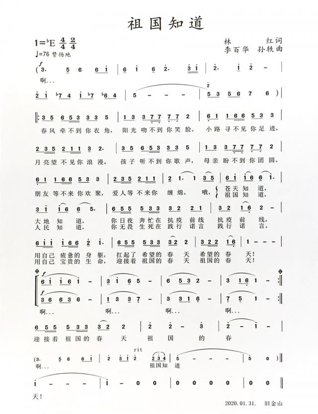 《祖国知道》这首诞生于抗疫非常时期的歌曲,是著名作曲指挥家、山东省艺术学院李百华教授在看到词作家林红发布的最新创作的歌词后被深深感动,在飞机上迅速地谱成歌曲,决心把这首抗击疫情的好作品推出来、唱出来,鼓舞士气,振奋精神,让人人感受到祖国的强大。