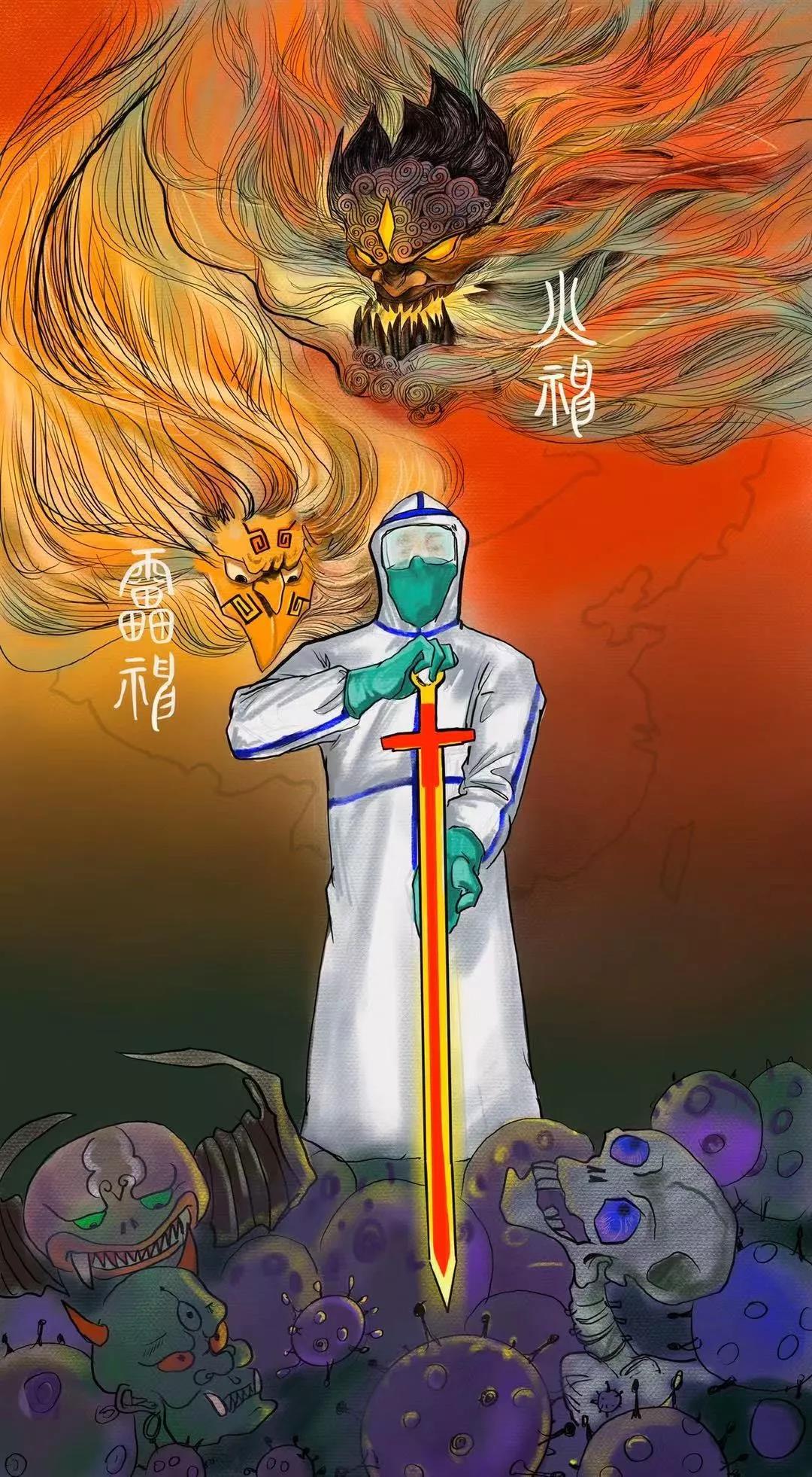 火神头上的花纹是奥运会火炬上的花纹,雷神脸上的花纹是中国传统的云雷纹。海报将两者结合起来,既感慨武汉火神山和雷神山医院建成的“中国速度”,也感叹战“疫”一线医生以大医精诚为真心、以人道主义为利剑,悬壶济天下,出鞘斩病魔的精神。