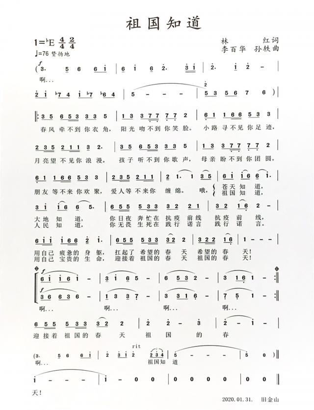 “好了,终于完成了”!当审阅最后一稿时已是旧金山当地时间2月15日凌晨4:30分了!这次李百华教授是满含激动的热泪看完的。天天在远方翘首期盼、等待着好的消息。从1月31日到2月15日,从创意策划,到远程统筹,经历了这么多天、这么多人的无私付出,李百华教授感慨万千:“我们这支首次合作、临时组建的合作团队成功了!在和平年代、在没有硝烟的战争中,我们手拉手、肩并肩,日日夜夜地共同战斗过!相信,在党中央正确领导下,这次伟大的战疫一定会取得最后的胜利!祝愿我们的祖国更加繁荣富强!作为曲作者,我要向所有参与《祖国知道》歌曲创作的团队、向全方位提供支持报道本次活动的文化视界网、山东教育电视台、大众网·海报新闻、齐鲁晚报·齐鲁壹点、济南广播电视台·济南网、齐鲁网·闪电新闻、鲁网·速豹新闻以及各大媒体表示衷心的感谢和崇高的敬意!”