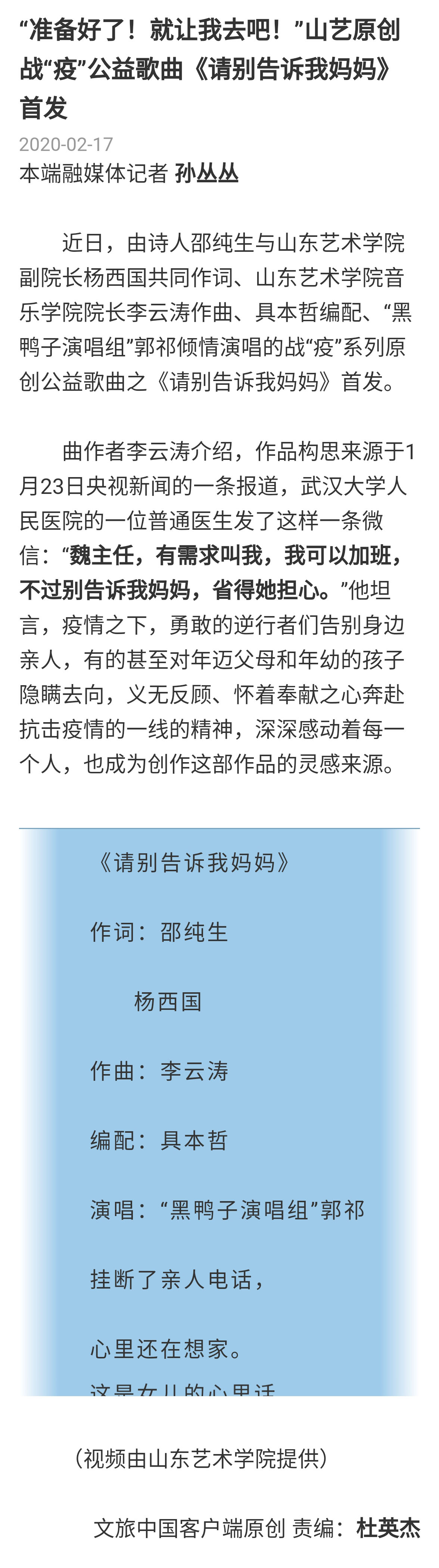 【文旅中国】“准备好了!就让我去吧!”山艺原创战“疫”公益歌曲《请别告诉我妈妈》首发