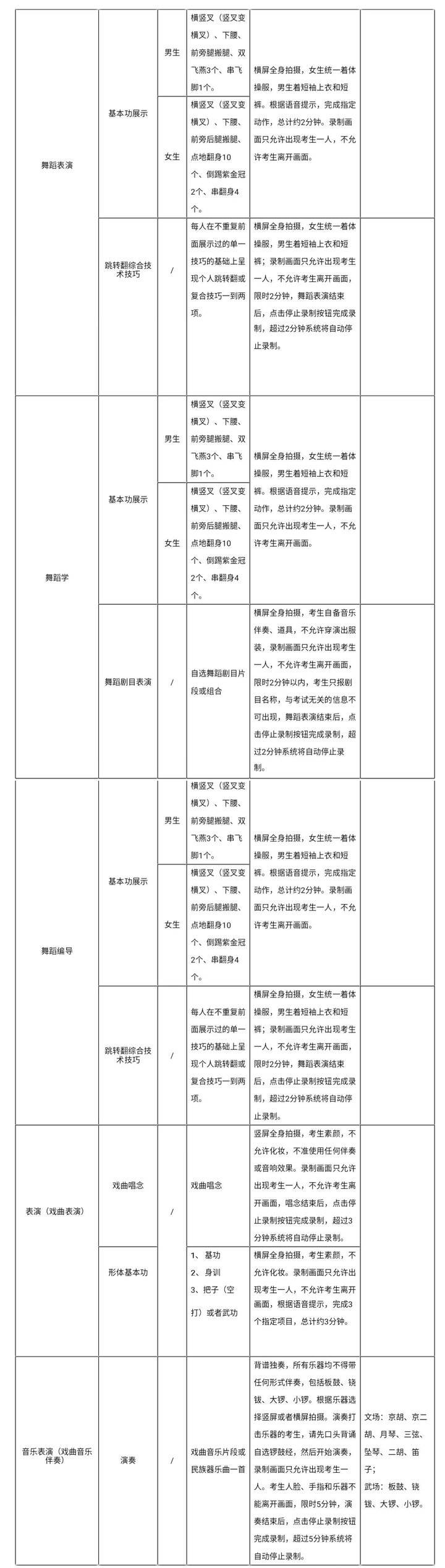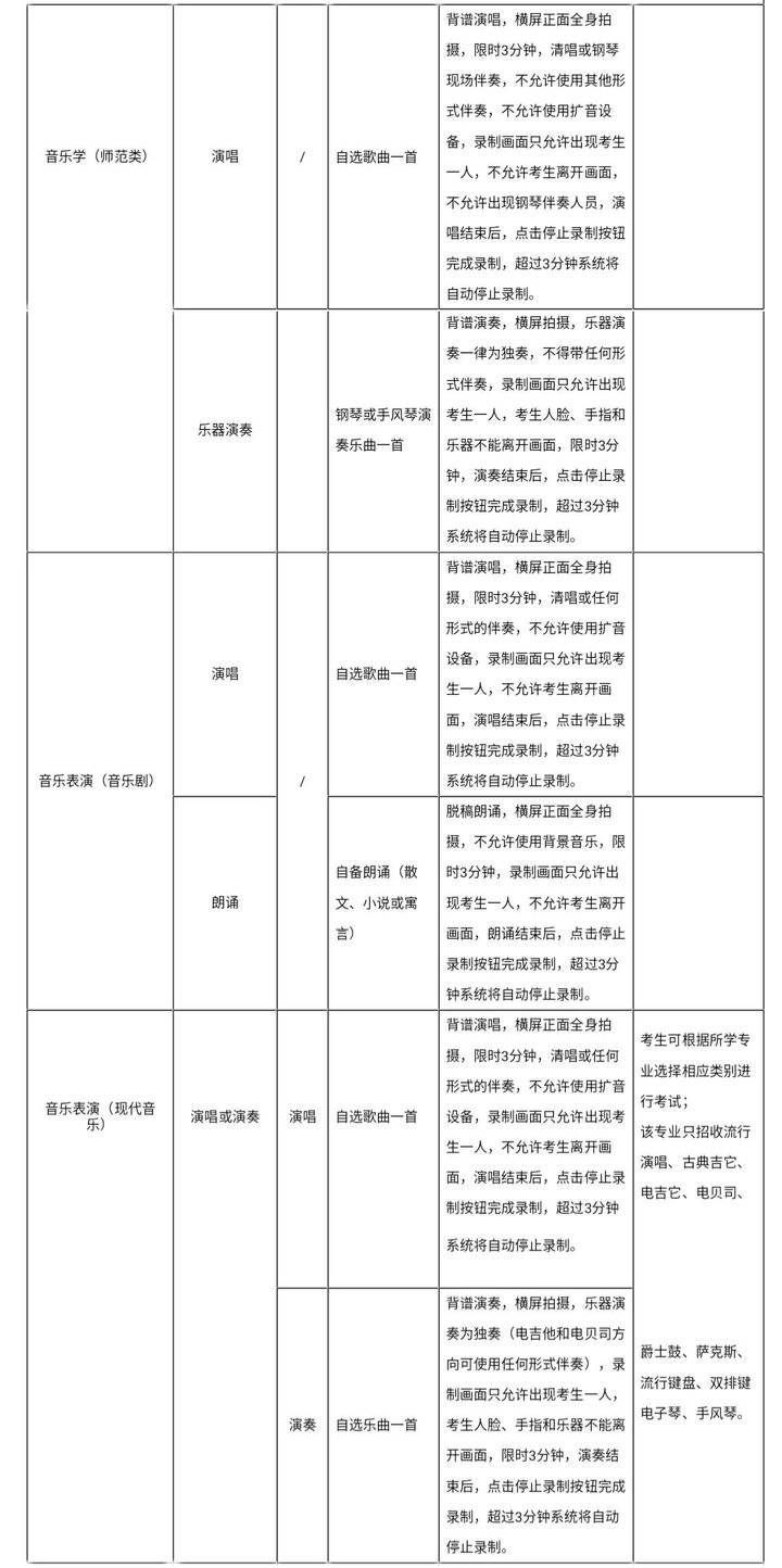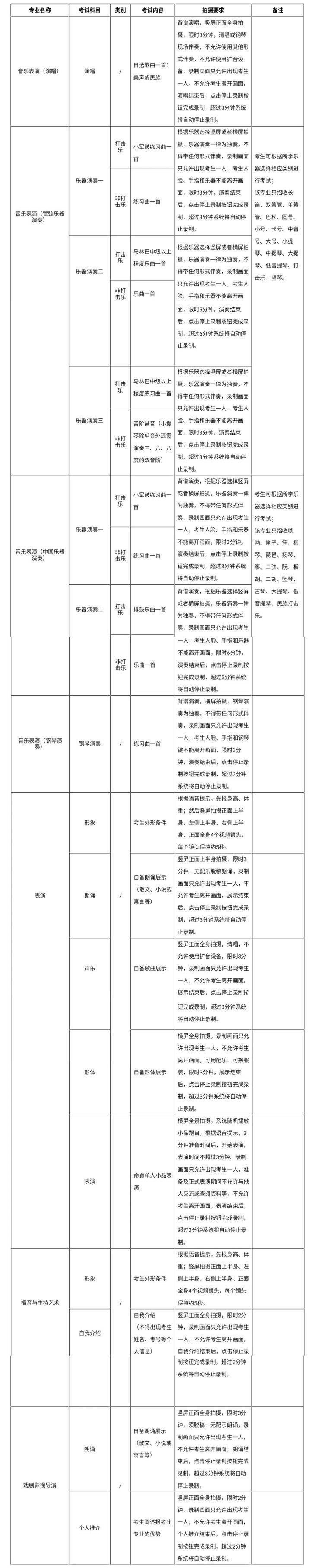 1.考生须保证作品的真实性,视频录制须同期不间断、不得转切、不得编辑美化。线上正式考试前,每一名考生均须签订考试诚信承诺书,未签订者取消考试资格;正式视频录制中,考生要严格按照拍摄要求进行视频录制,不得离开拍摄画面,不得出现任何显示考生信息的提示性文字、图案、声音、背景、着装等,更不得出现考生姓名、考号等个人信息,否则将被视为违规,并取消考试资格,考生录制视频环境等其它客观因素不影响专业成绩评定。考试各环节出现违规作弊行为的,视情节轻重,依据《中华人民共和国刑法修正案(九)》以及《国家教育考试违规处理办法》(教育部令第33号)等确定的程序和规定进行处理。