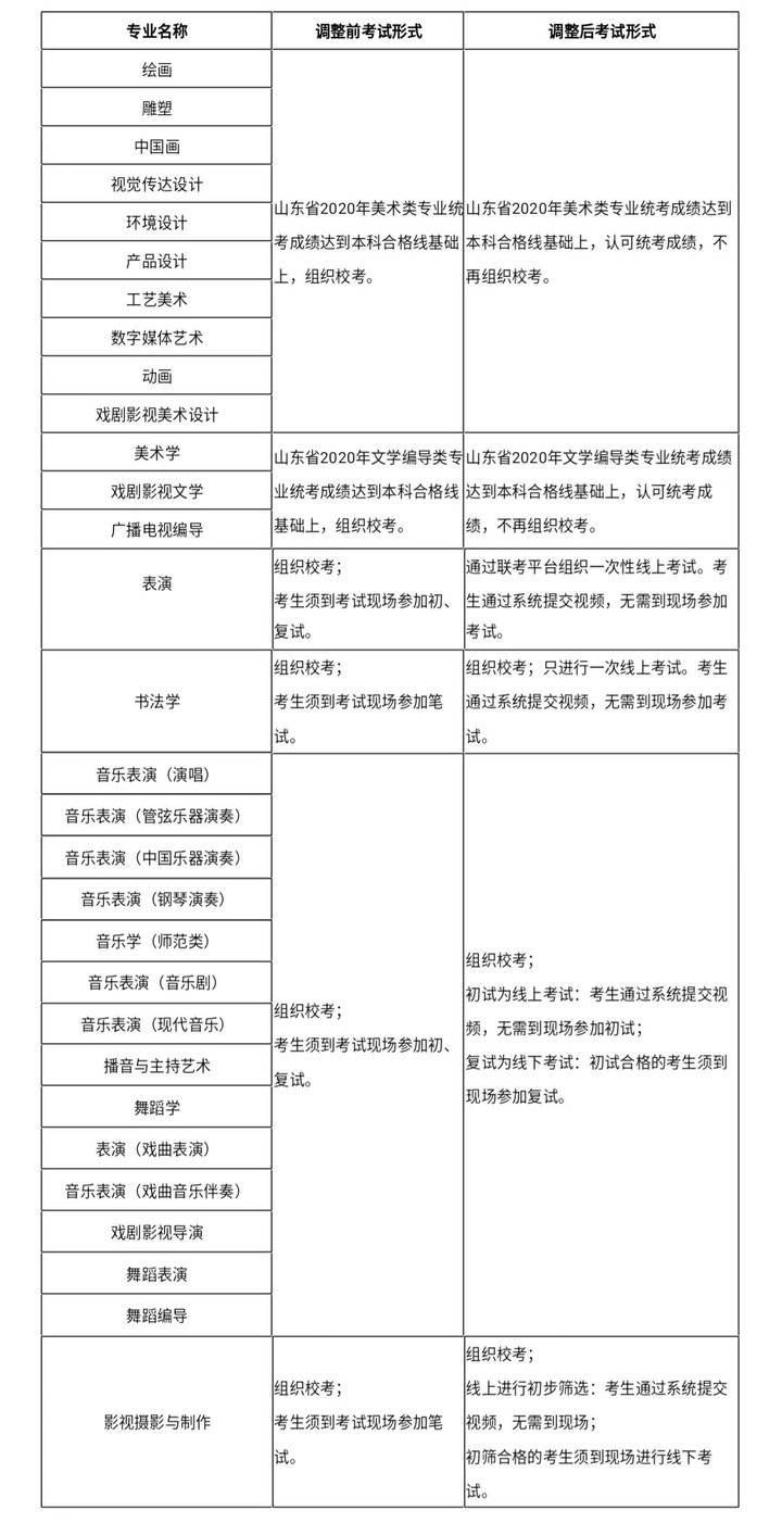 根据调整方案,2020年山东艺术学院美术类专业、文学编导类专业不再组织校考,而是采用省统考成绩。表演、书法学、音乐与舞蹈类专业、影视摄影与制作四类专业实行线上考试。不过,表演与书法学专业只组织一次线上考试,音乐与舞蹈类专业、影视摄影与制作只在线上进行初试,初试合格后,仍必须到线下参加复试。