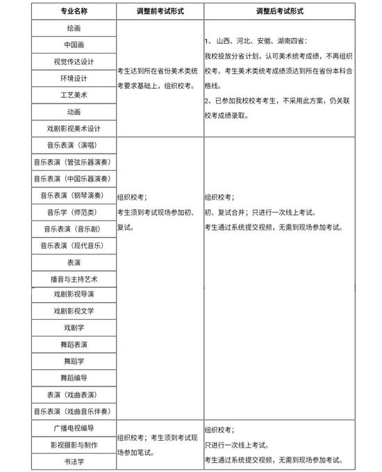 山东艺术学院2020年本科专业招生考试调整实施方案(省内)今早刚刚发布,据统计,今年省统考覆盖的13个专业取消现场校考,采用统考成绩。其它多个面试类专业采用线上考试,线上考试规模达3.5万人。