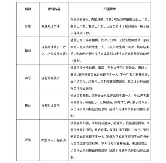 1。考生须保证作品的真实性,视频录制须同期不间断、不得转切、不得编辑美化。线上正式考试前,每一名考生均须签订考试诚信承诺书,未签订者取消考试资格;正式视频录制中,考生要严格按照拍摄要求进行视频录制,不得离开拍摄画面,不得出现任何显示考生信息的提示性文字、图案、声音、背景、着装等,更不得出现考生姓名、考号等个人信息,否则将被视为违规,并取消考试资格,考生录制视频环境等其它客观因素不影响专业成绩评定。考试各环节出现违规作弊行为的,视情节轻重,依据《中华人民共和国刑法修正案(九)》以及《国家教育考试违规处理办法》(教育部令第33号)等确定的程序和规定进行处理。