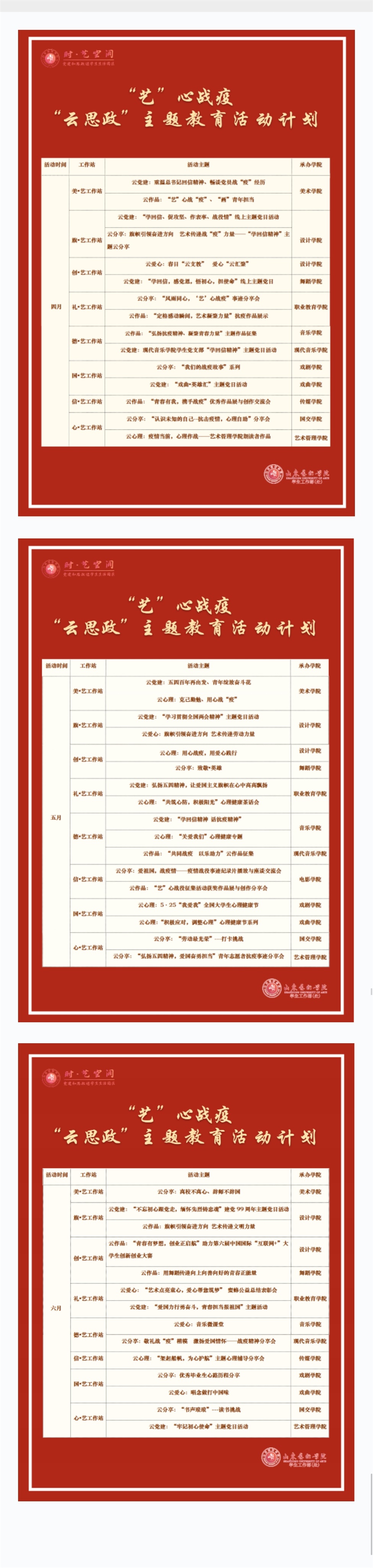 “艺”一方面是指以山艺“时·艺空间”党建、思政进学生生活园区各主题工作站为依托,另一方面是要彰显艺术类专业特点。此次系列“云思政”主题教育活动,旨在结合艺术类学生的实际,通过开展“云党建”、组织“云分享”、征集“云作品”、奉献“云爱心”、推进“云心理”等形式多样的线上主题教育活动,鼓励、引导青年学生走进生活、体悟生活,弘扬战“疫”精神、培养家国情怀,并努力将自己的经历、所思所想,以作品的形式凝练、提升,去传递向上向善向好的青春正能量。