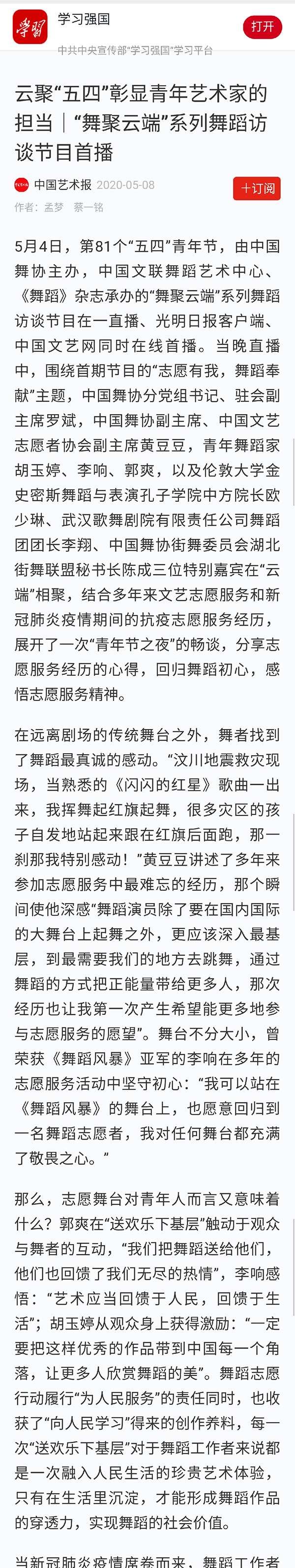 【学习强国】云聚“五四”彰显青年艺术家的担当|“舞聚云端”系列舞蹈访谈节目首播