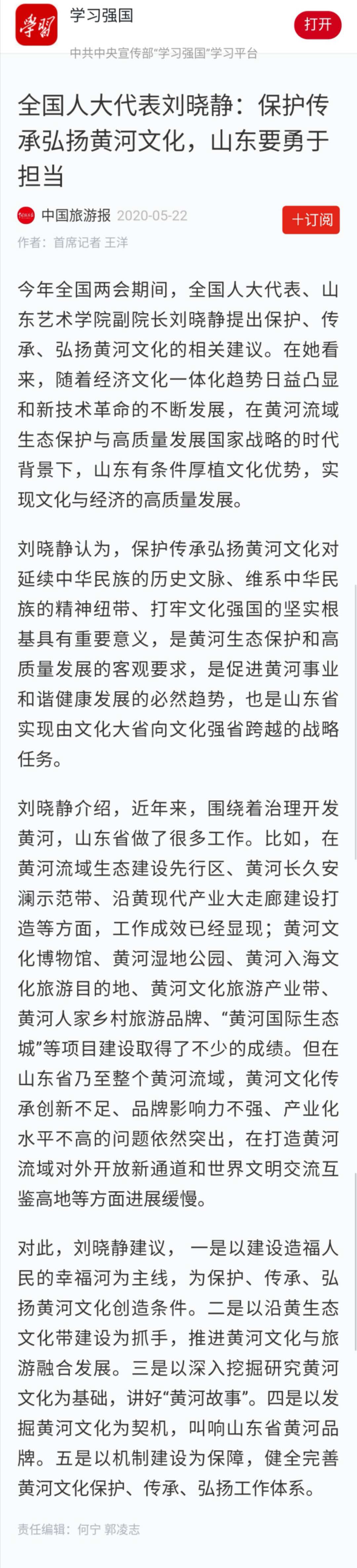 【学习强国】全国人大代表刘晓静:保护传承弘扬黄河文化,山东要勇于担当