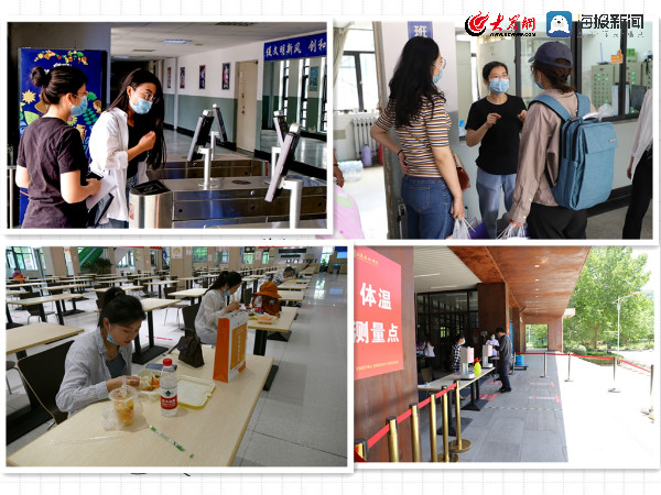 学校严密做好各项服务工作,全力保障学生安全返校。返校当日,学校在济南西站、济南站、济南东站、长途汽车总站“点对点”接运学生返校。在两校区门口,学校安排了学工干部、医务人员、安保人员对返校学生进行体温检测、身份登记,对学生行李进行消毒,并用摆渡车将学生送到学生公寓和教学楼。在公寓入口,学生经过面部识别及自动测温系统的身份识别和体温测量登记后进入宿舍,宿管人员和辅导员亲自帮学生将行李送到宿舍。午餐时间,餐厅为返校学生准备了丰盛餐食,学生测温并手部消毒后在餐厅单向就坐用餐。超市商品齐全,食品、生活用品充足,为返校学生的日常生活提供了基本保障。学校还为学生精心准备了装有《学生公寓疫情防控小贴士》、口罩、酒精消毒湿巾、中药香囊、返校餐券的健康礼包;相关二级学院还为毕业班学生定制了“永恒的记忆”纪念礼品,体现了对学生的浓浓关爱。