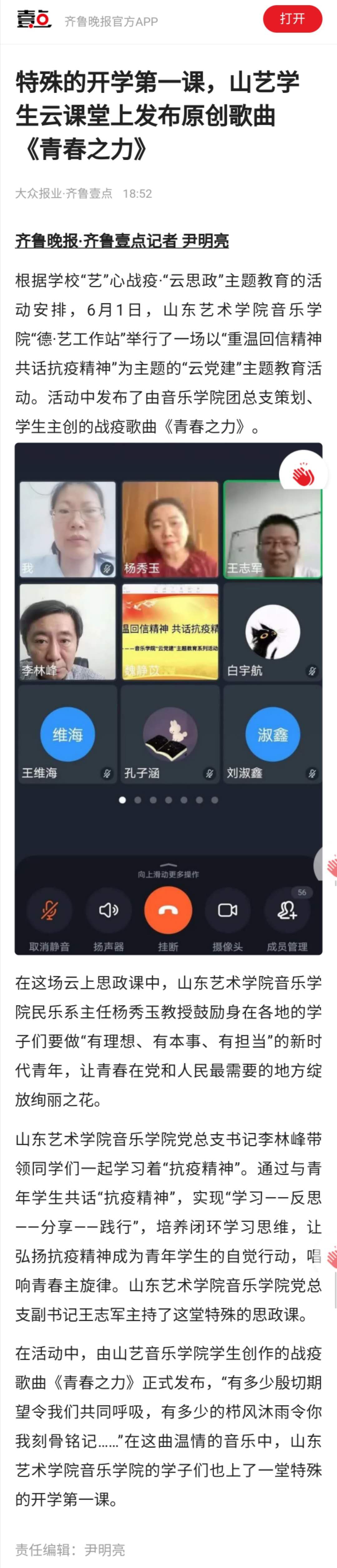 【齐鲁壹点】特殊的开学第一课,山艺学生云课堂上发布原创歌曲《青春之力》