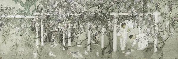 我的写生本里只有春天和秋天,缺少冬天和夏天。因为冬天我怕冷,怕冻手,无法执笔;夏天又怕热,怕晒,怕蚊虫叮咬。记得早些年济南的夏天没有空调酷暑难耐,是我这个从海边来的胶东人最难熬的季节,汗水常常顺着下巴滴到画纸上,让人自然会想到“汗滴禾下土”的名句,而在我这里是“汗滴案上图”。所以冬夏这两个季节我是很少外出写生的。此时,我打开了一本春天写生的白描,走进了一段家园春色的记忆。这里春风吹拂,每天都上演着浪漫多彩的生命故事。为了躲避热闹的春天,我偶然走进一个老教堂的庭院,院中央一架紫藤吸引了我,紫色的花开得疏密有致,有的紫色像瀑布一样,遮住了粗壮的盘龙卧虹般的粗干,那是一颗百年老藤,像一个百岁老人正在抚摸着春天,静静地等着我的到来,这架紫色的灿烂云霞把我震撼,内心的柔软和敬畏正悄悄被唤醒,春天里的画笔终于落到了实处。我感恩春天的家园给我的馈赠,正是从老家烟台这座百年老教堂的庭院起步,开始了我在春天里一路寻访、考察、写生、创作紫藤和与紫藤有关的历程。近十多年,我寻访紫藤脚步遍布山东全省。例如嘉祥的青山寺、青州的范公寺、青岛的中山公园,济南的趵突泉公园,都曾留下我寻访的身影。近几年我寻访的足迹不断拓展,曾访问过苏州博物馆院内的一颗近四百年历史的老藤,据说是明代大画家文徵明亲手所植,举头望去如苍龙倒挂,气势恢宏,震撼着一代代前来拜谒的造访者。几年下来,我研究紫藤的写生已集有三四本之多,我常常打开这些本子,做着紫色的梦……