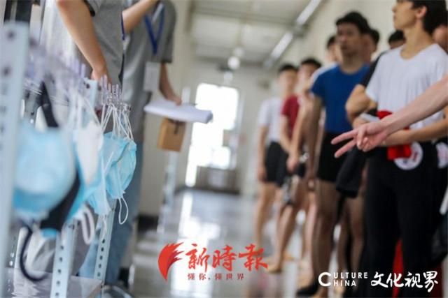 7月14日,在山东艺术学院长清校区,艺考生们佩戴口罩在候场室内做热身运动,准备进行复试考试。