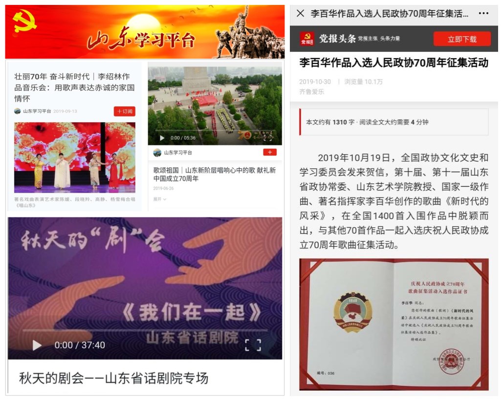 中国教育在线讯 2019年2月至2020年10月,山东艺术学院教授李百华的7部优秀音乐作品相继在“学习强国”平台发布,以音乐的艺术形式唱响时代强音,激昂时代主旋律,传播山艺正能量。