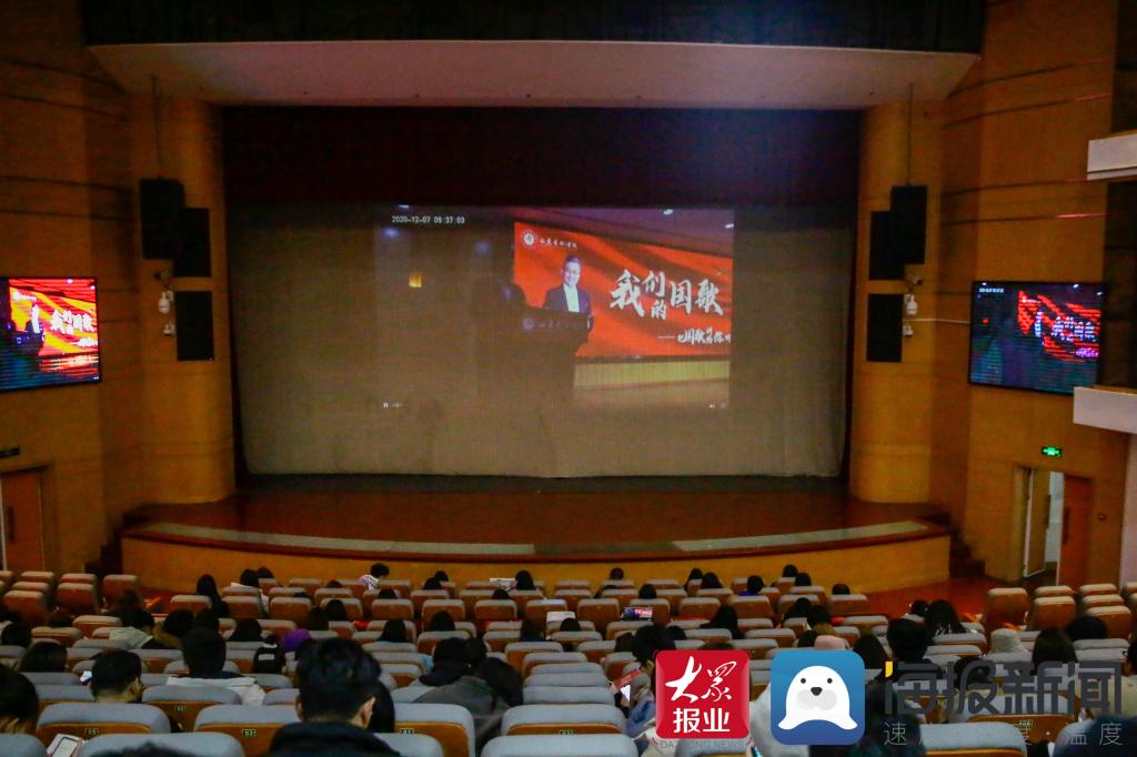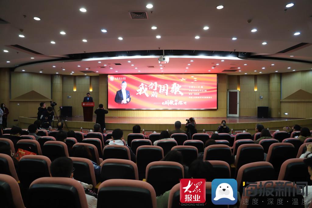于海先生依次从“关于国歌”“中华人民共和国国歌的发展历程”“国歌是国家神圣的象征”“国歌是家国情怀的重要内容”和“我们的国歌是世界上最好的国歌”5个部分,为大家阐述了国歌之美及其重要性。“我们的国歌有84个字,37个小节,标准时长是46秒,这是每一个中国人都应该牢记的。”于海先生动情的说。围绕国歌产生的文化背景、历史渊源、地位意义等,他结合多年的实践经历,以叙事的视角生动地展开讲述。通过音乐播放与现场讲解相结合的方式,旁征博引地讲述了中外国歌的历史和典故,并通过分享《中华人民共和国国歌》(《义勇军进行曲》)创作历程和背后的故事,阐明了国歌所具有的崇高地位,展现了国歌作为国家声音的标志、民族精神的体现、国家文化的结晶和公民爱国主义载体的重要意义。他讲到,每一段国歌都有一段独特的故事,国歌也见证着那段光辉而艰难的民族岁月,国歌背后的一个个故事也蕴含着一个国家强大的力量。“《义勇军进行曲》体现了中华民族的光荣传统,产生了推动中国社会前进的巨大力量,它是各族人民共同的精神支柱。”报告会结束时,在于海先生的带领指挥下,全体师生起立,挥舞着国旗,情感饱满地唱响了激昂的《国歌》。