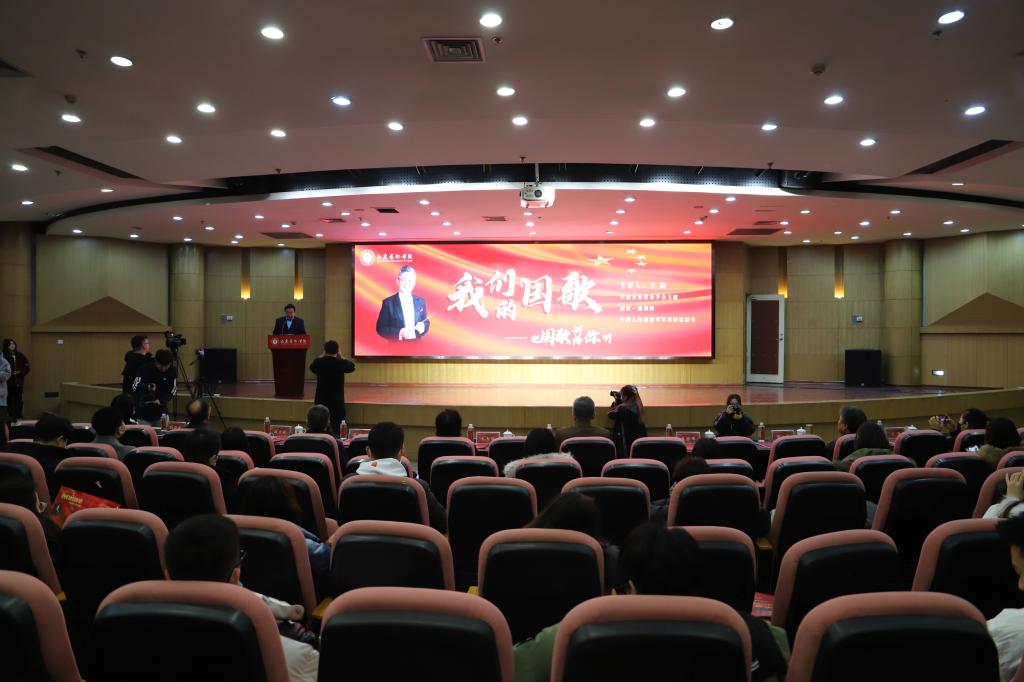 报告会结束时,在于海先生的带领指挥下,全体师生起立,挥舞着国旗,情感饱满地唱响了激昂的《国歌》。