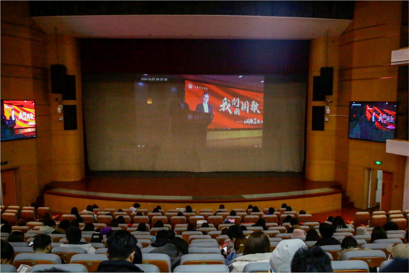于海先生依次从“关于国歌”“中华人民共和国国歌的发展历程”“国歌是国家神圣的象征”“国歌是家国情怀的重要内容”和“我们的国歌是世界上最好的国歌”5个部分,为大家阐述了国歌之美及其重要性。“我们的国歌有84个字,37个小节,标准时长是46秒,这是每一个中国人都应该牢记的。”于海先生动情的说。围绕国歌产生的文化背景、历史渊源、地位意义等,他结合多年的实践经历,以叙事的视角生动地展开介绍。通过音乐播放与现场讲述相结合的方式,旁征博引地讲述了中外国歌的历史和典故,并通过分享《中华人民共和国国歌》(《义勇军进行曲》)创作历程和背后的故事,阐明了国歌所具有的崇高地位,展现了国歌作为国家声音的标志、民族精神的体现、国家文化的结晶和公民爱国主义载体的重要意义。他说,每一段国歌都有一段独特的故事,国歌也见证了那段光辉而艰难的民族岁月,国歌背后的一个个故事也蕴含着一个国家强大的力量。“《义勇军进行曲》体现了中华民族的光荣传统,产生了推动中国社会前进的巨大力量,它是各族人民共同的精神支柱。”报告会结束时,在于海先生的带领指挥下,全体师生起立,挥舞着国旗,情感饱满地唱响了激昂的《国歌》。