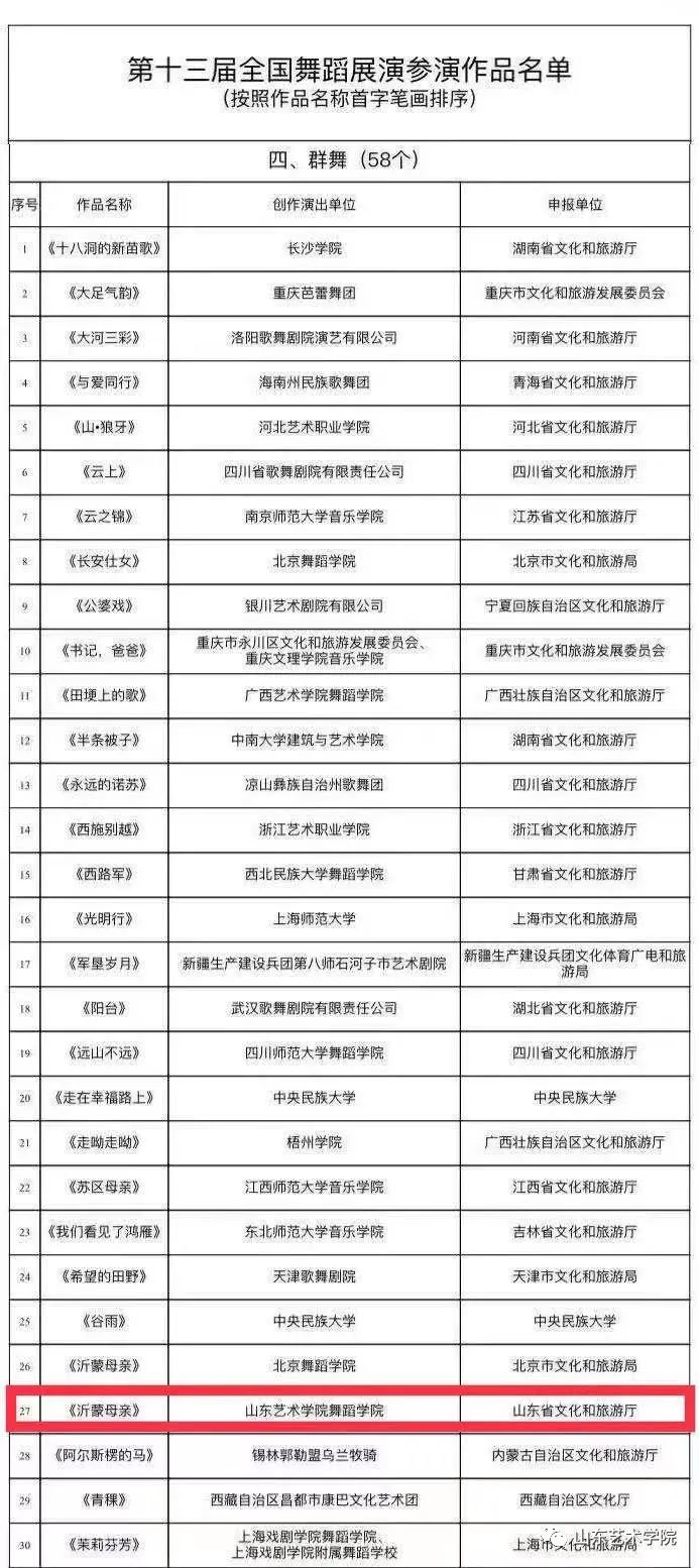 近日,由文化和旅游部、广东省人民政府主办的第十三届全国舞蹈展演参演作品名单公布,山东艺术学院舞蹈学院原创作品群舞《沂蒙母亲》和《移山》成功入选。作为山东省唯一入选的院校,学校将代表山东用舞蹈向全国人民展现齐鲁文化风韵。