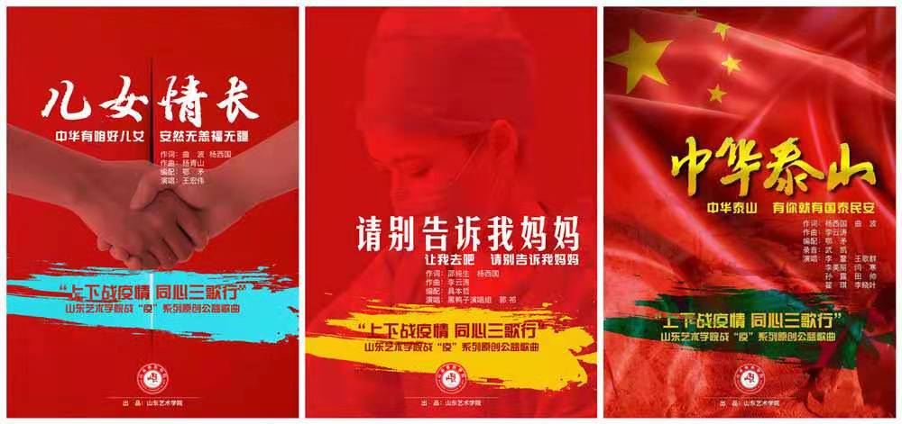 疫情期间,山艺师生积极响应党和国家的号召,以艺术创作驰援抗击疫情,感悟中华民族众志成城、共克时艰的壮举和豪迈,共上一堂战"疫"思政课。以“上下战疫情 同心三歌行”《儿女情长》《请别告诉我妈妈》《中华泰山》三首原创公益歌曲为代表,创作出390部艺术形式多样的战“疫”作品。这三首歌曲婉转悠扬,铿锵有力,充满希望,振奋人心,反映出山艺师生坚持现实主义创作道路,与一线工作者同心战"疫",为时代放歌,为人民抒情,以艺术的力量驰援战“疫",唱响不畏时艰、勇于担当使命,奋起抗击疫情的战歌,让艺术之花在疫情防控一线灿烂绽放。一经发布,公益歌曲荣登学习强国平台,被央视频、文旅中国等媒体转发,得到了社会各界的广泛好评,荣获教育部“共抗疫情、爱国力行”主题宣传教育和网络文化成果征集展示活动歌曲类优秀奖。