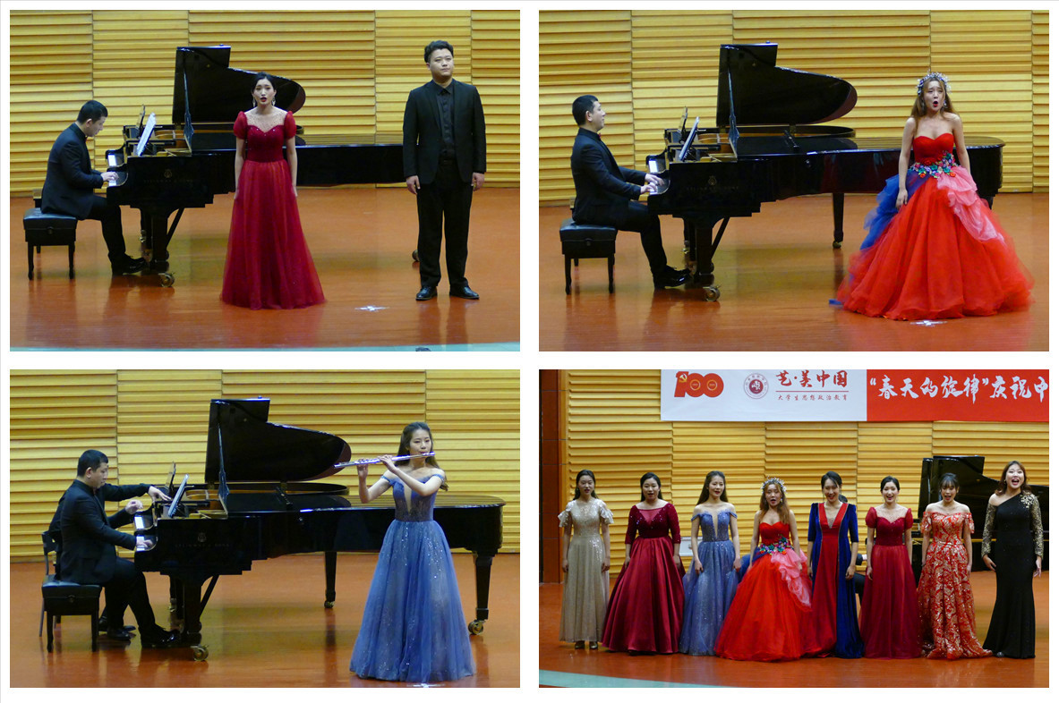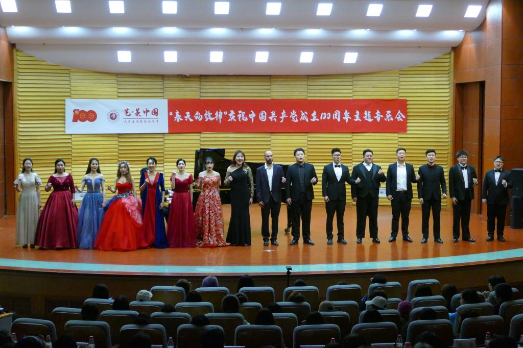 音乐会由音乐学院副教授唐庆担任艺术指导,在女声独唱《唱支山歌给党听》优美的旋律中拉开序幕,熟悉的乐曲道出了万千人民对于党的无限忠诚与热爱。钢琴独奏《山丹丹开花红艳艳》、古筝独奏《浏阳河》、钢琴协奏曲《黄河》、男声独唱《追寻》讲述了中国共产党领导中华儿女反抗侵略、争取民族独立与解放的故事,仿佛将我们带回到那段史诗般的英雄岁月。女声独唱《我爱你中国》、竹笛独奏《小放牛》、女声独唱《又见梨花》、长笛独奏《阳光灿烂照天山》描绘了中国共产党领导人民建设社会主义新中国的美好画卷。男声独唱《跟你走》《清晰的记忆》《向往》、男女声二重唱《不忘初心》表达了共产党人的崇高理想信念和对建设美好生活的向往。男女声二重唱《共筑中国梦》《灯火里的中国》唱出在中国共产党领导下,新时代人民生活的新气象,努力实现中华民族伟大复兴的不懈追求。音乐会最后,全体演员齐声合唱《到人民中去》,观众席中70名同学以快闪的方式参与合唱,真情歌颂以为人民服务为根本宗旨、以为中国人民谋幸福为奋斗目标的中国共产党。一段段经典的旋律,勾起了在场观众的美好记忆,也唤起了大家的爱党爱国爱社会主义的深厚感情,赢得观众经久不息的掌声。