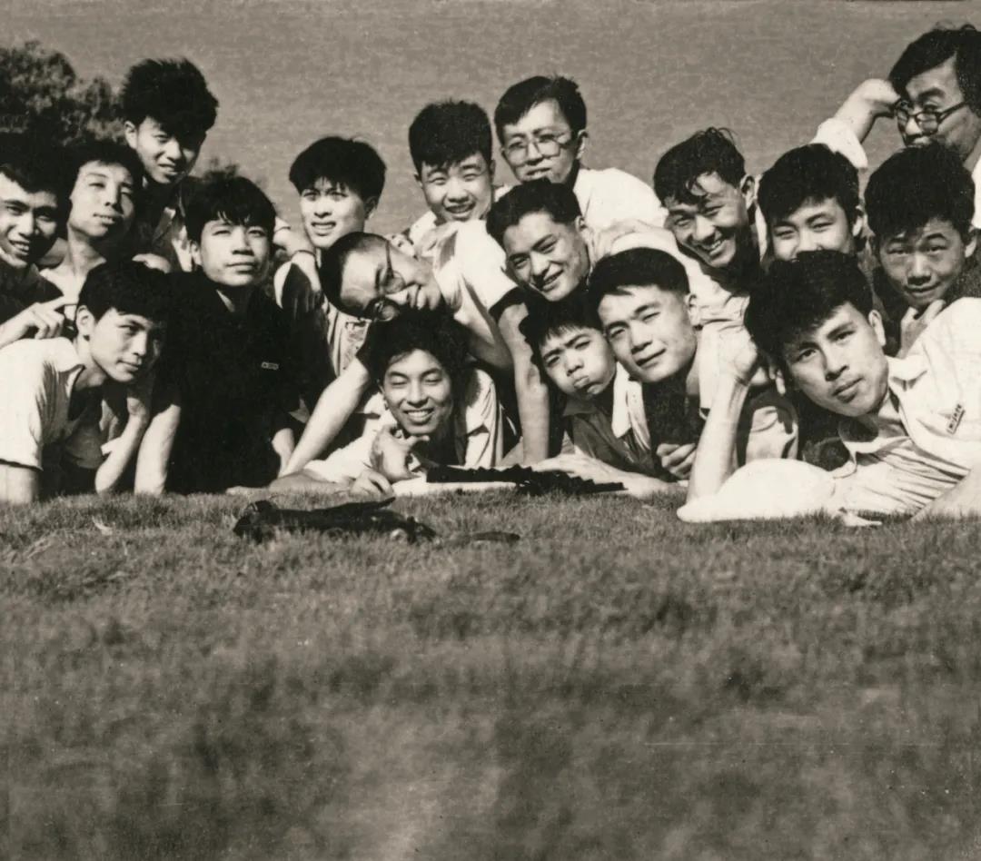 1960年9月,油画系二年级全班同学欢聚在柳浪闻莺公园,前排左起高友麟(友林)、彭兆光、施绍辰、褚士明、胡振玉(振宇),中排左起丁仪新、曲志刚(进修生)、张洪祥、顾百岁、不详(进修生)、朱璞(朴)、赵芝辉、郑源迈,后排左起罗会刚、陆庭祥、不详(进修生)、白仁海、曾崇仁