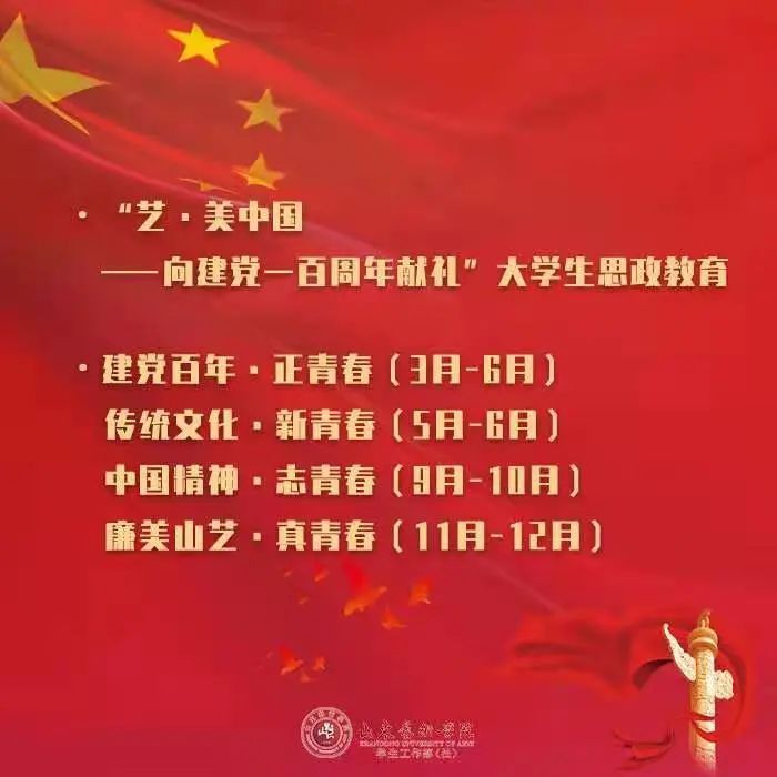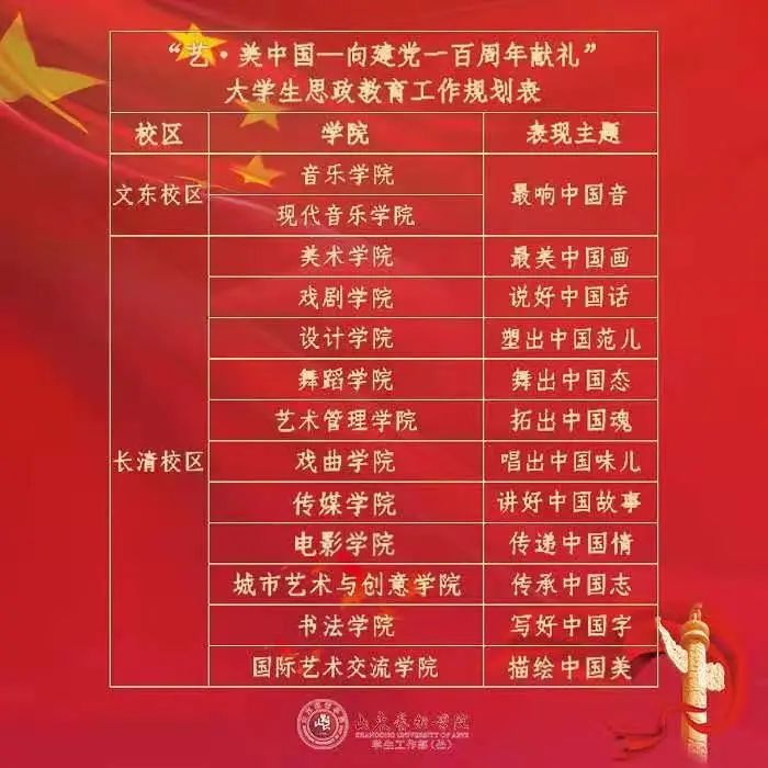 各二级学院、“时•艺空间”各主题工作站,将以《“艺•美中国——向建党一百周年献礼”大学生思政教育工作规划表》的初步规划,以本次思政教育工作的四个内容为切入点,结合自身专业、学生思政教育实际开展相关工作。