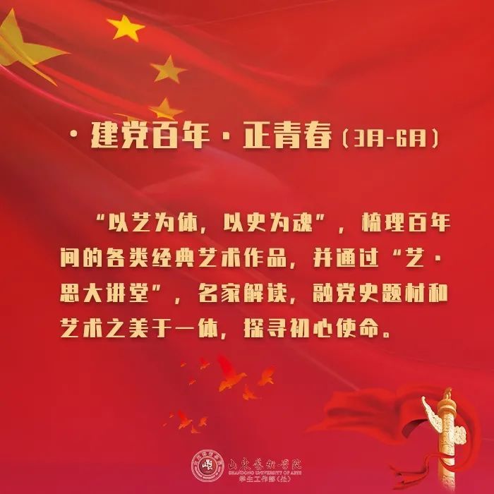 2021年,中国共产党迎来百年华诞。站在建党百年的新的历史方位,伟大的中国共产党正青春。作为山东省唯一一所综合类艺术院校,如何在夯实专业教育的基础上,引导青年学生扎根中国大地,与民族共命运、与人民同呼吸,通过自己的艺术创作,展现征程波澜壮阔、初心历久弥坚的百年,历来是学校学生思政教育的重心。