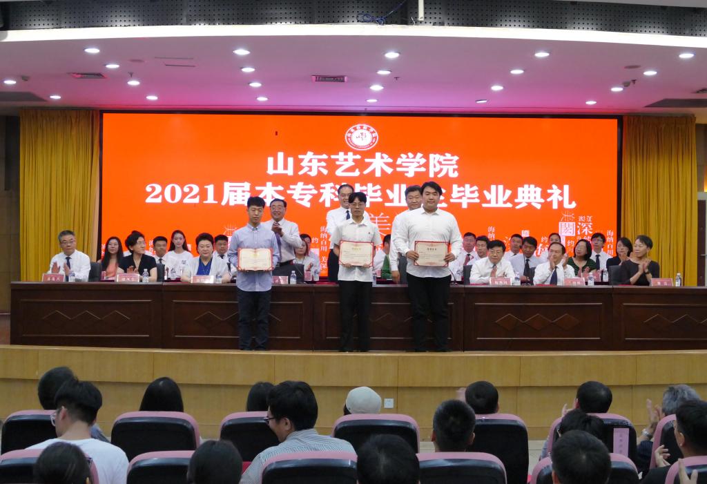 典礼上,杨西国宣读了《关于表彰2021届优秀毕业生的决定》《关于授予刘洪铖等同学“山东艺术学院优秀青年志愿者标兵”称号的决定》和《关于表彰山东艺术学院2021届“十佳优秀毕业生”的通报》,对137名省级优秀毕业生、416名校级优秀毕业生和3名学校优秀青年志愿者标兵、2021届“十佳优秀毕业生”进行了表彰。学校领导为优秀毕业生代表,参加西部计划的优秀志愿者标兵刘洪铖、张敬轩、梁孝慈,“十佳优秀毕业生”马磊、王倩、成亚生、吕升虹、刘凯迪、刘逸群、刘雅然、李朝阳、张元、曹传琛同学颁发了荣誉证书。“十佳优秀毕业生”向任课老师敬献鲜花并合影留念。
