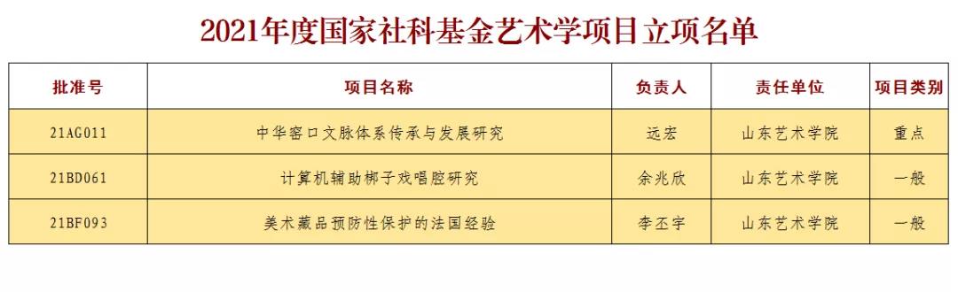 近日,山东艺术学院3个项目入选2021年度国家社科基金艺术学项目,包括重点项目1项,一般项目2项,立项数量在全国同类高校中名列前茅。