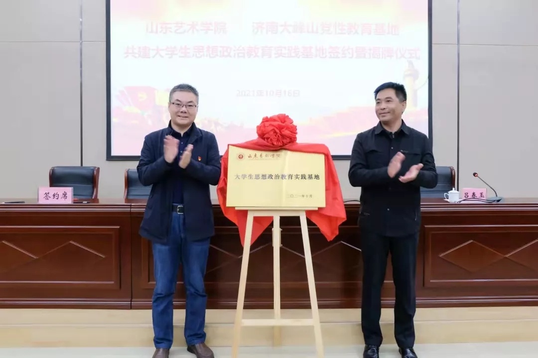 仪式上,双方签署了《山东艺术学院 济南大峰山党性教育基地大学生思想政治教育实践基地共建协议书》,苏茂兴、蒋立亮为“山东艺术学院大学生思想政治教育实践基地”揭牌。