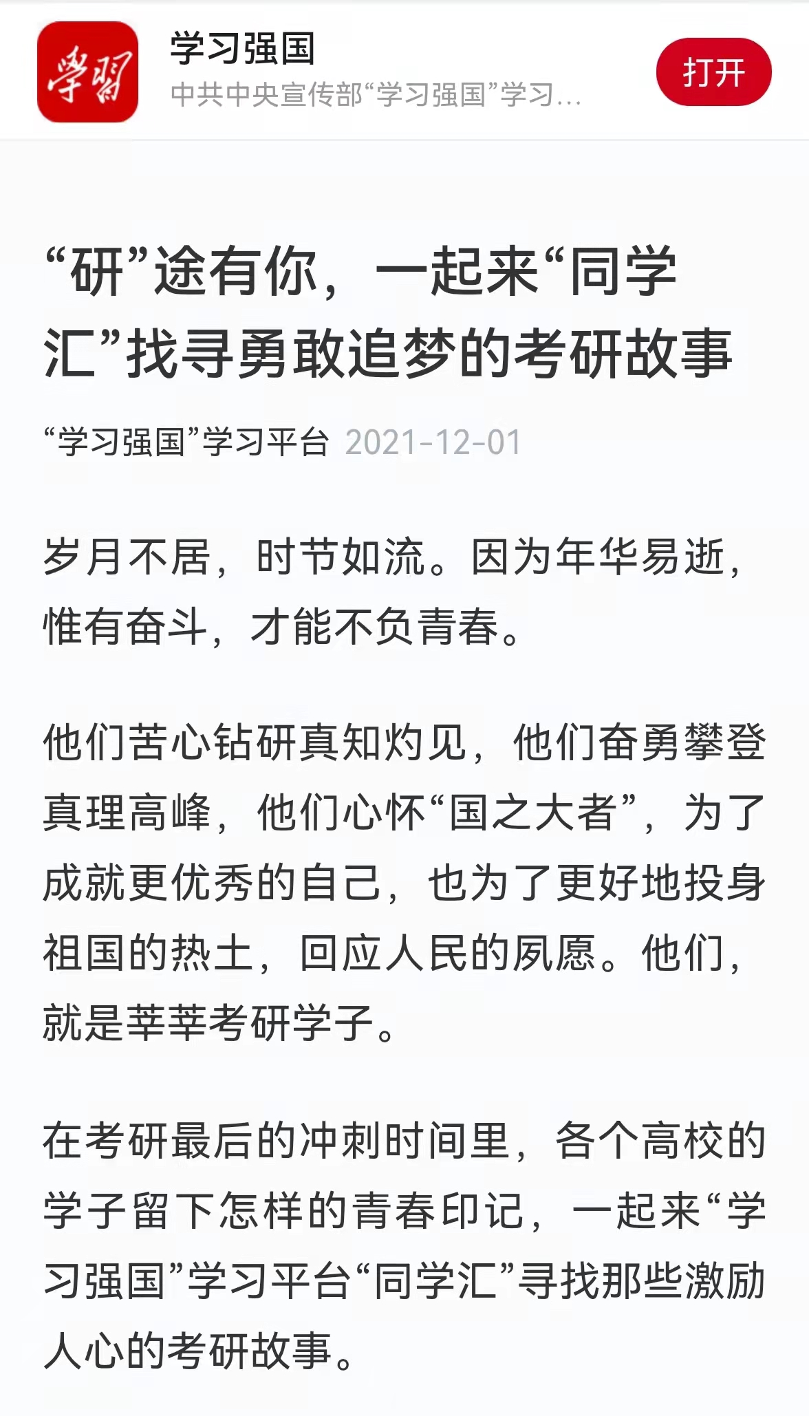 【学习强国学习平台】“研”途有你,一起来“同学汇”找寻勇敢追梦的考研故事