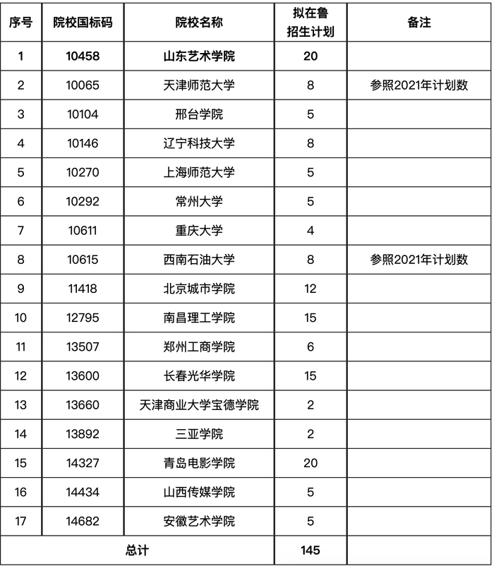 1月22日,山东省2022年表演类专业联考实施方案(山东艺术学院平台)发布,表演联考由牵头高校即山东艺术学院主考,联盟高校共享共用联考成绩。本次联考联盟共包含省内外17所高校,在鲁招生计划共计145人,其中山艺为20人。