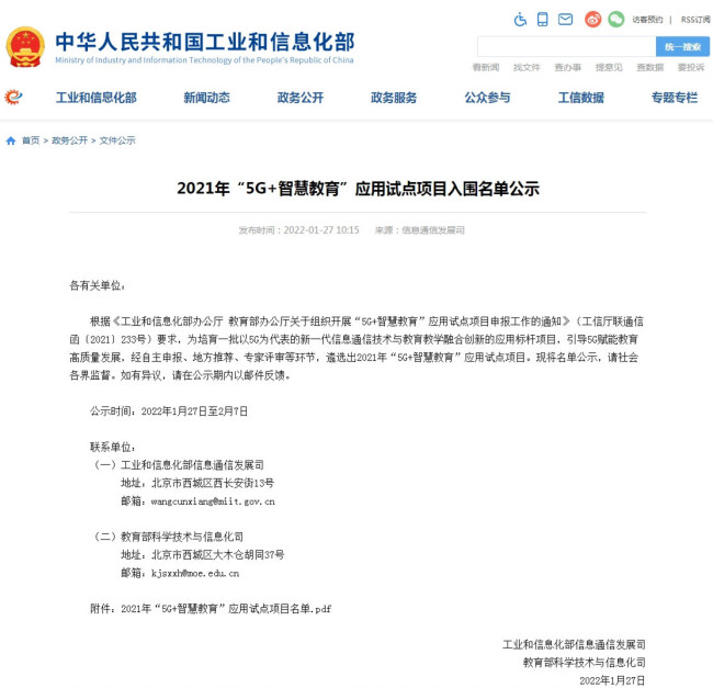 1月27日,工业和信息化部信息通信发展司、教育部科学技术与信息化司发布了《2021年“5G+智慧教育”应用试点项目入围名单公示》,山东艺术学院申报的《以美育德,以美启智,以美践行——基于“5G+4K”智慧美育协同创新基地建设》项目成功入围,是全国唯一一个由艺术院校牵头的项目。