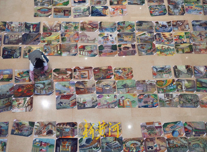 记者在色彩科目阅卷现场看到,考生试卷整齐地铺了一地,十分壮观;评委约3人一组,每人手持一根长竹竿,成为美术阅卷现场独有的画面。