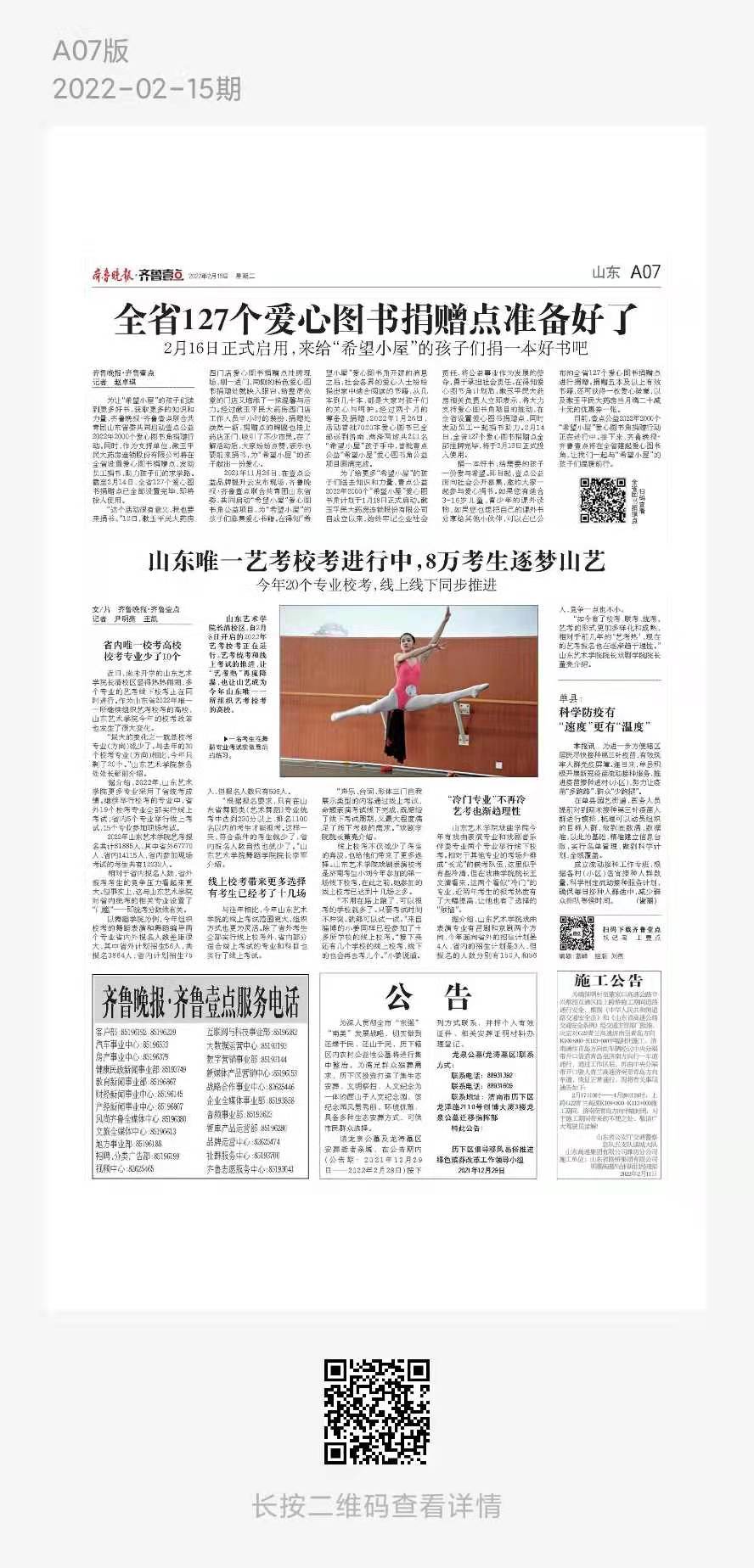 据介绍,2022年,山东艺术学院更多专业采用了省统考成绩。继续举行校考的专业中,省外19个校考专业全部实行线上考试;省内5个专业举行线上考试,15个专业参加现场考试。