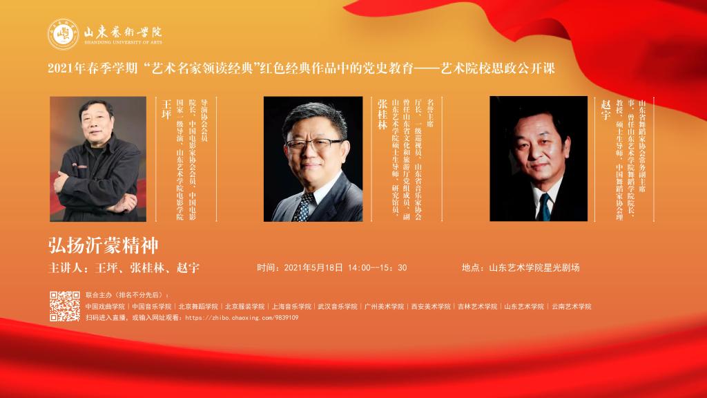 学校组织开展“弘扬沂蒙精神”红色经典作品中的党史教育系列公开课,邀请电影《沂蒙六姐妹》、舞蹈《沂蒙那座—桥》和歌剧《沂蒙山》创作人讲述红色艺术作品。主讲嘉宾阐述了各自创作的初衷、剧组在沂蒙采风的情况、主创人员塑造人物的过程等背后的故事。现场师生学习了沂蒙精神形成的历史逻辑、理论逻辑、实践逻辑,以及沂蒙精神的特质内涵。