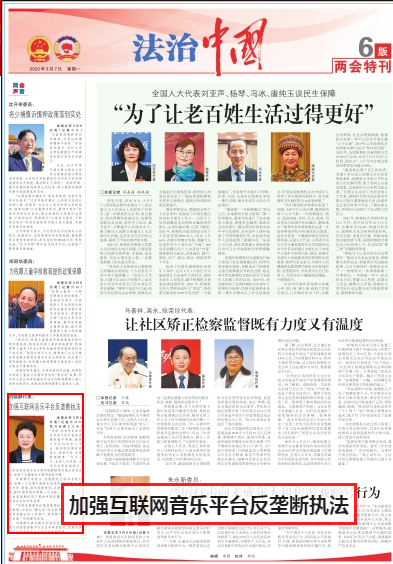 本报北京3月6日电(记者张灿灿 见习记者王昱璇)“当前,约束资本在音乐市场无序扩张的法律依据不明确,致使大平台打压中小平台、抢夺版权等时有发生,版权买卖、交易数额随意。”今天上午,全国人大代表、山东艺术学院副院长、山东省音乐家协会主席刘晓静接受本报记者采访时,谈到了音像版权互联网垄断问题。