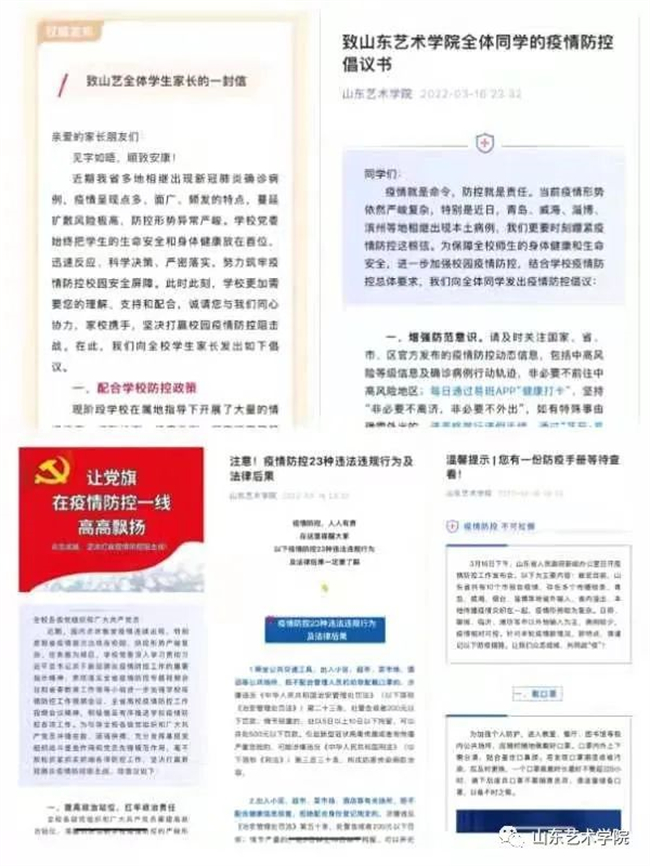 通过温馨提示、“致全体学生家长的一封信”“致全体同学的疫情防控倡议书”以及线上主题教育班会等形式,引导家长和同学正确认识、积极应对疫情形势,了解疫情防控规定,落实疫情防控要求,配合学校防疫工作,共同守护平安校园。对少数未返校学生,由各学院开展家校沟通活动,辅导员负责与学生本人及其家长保持联系,落实具体情况,做到一人一策,最大限度畅通家长了解信息的渠道,以实实在在的沟通服务让家长放心。(图文由山东艺术学院授权发布)