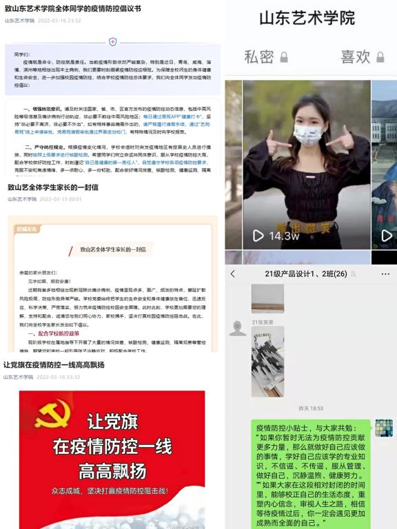 从《致全体学生的疫情防控倡议书》引导学生做好自己,到《致学生家长的一封信》网上答疑,再到《致全校各级党组织和广大共产党员的倡议书》号召各级党组织和广大共产党员投身疫情防控,山东艺术学院这“三步曲”让疫情防控网络思政课更走心。3月份新冠肺炎疫情散发、多发以后,山东艺术学院官方微信、微博、抖音等网上媒体发布了30余篇宣传学校疫情防控形势和疫情防控措施的推送,大学生记者团拍摄的短视频《战“疫”手势舞》在抖音平台发布后,半小时点击量高达14.3万,各二级学院、各部门的网络媒体也先后推送疫情防控信息210余条,积极引导师生情绪、传递战疫必胜的信心。戏剧学院2018级导演专业学生付庚辰说,“这次疫情是最好的教科书,学校相对封闭管理,既确保了我们安全健康,又给我们提供了暖心的服务。作为即将毕业的学生,相对封闭管理虽然有一些不适应,但我也很庆幸有了更多和学校、同学朝夕相处的日子。”在学生管理服务过程中,设计学院2021级产品设计专业的班主任张恒旺老师还通过微信群向学生发出倡议,“如果你暂时无法为疫情防控贡献更多力量,那么就做好自己应该做的事情,学好自己应该学的专业知识,不信谣、不传谣,服从管理、做好自己,沉静温煦、健康努力。”“如果大家在这段相对封闭的时间里,能够校正自己的生活态度,重塑内心信念,审视人生之路,相信等待疫情过后,你一定会遇见更加成熟而全面的自己。”