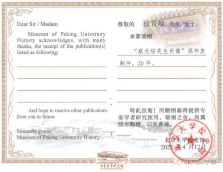 近日,山东艺术学院院长徐青峰教授向北京大学捐赠《蔡元培先生像》限量发行版画作品20件,作品收藏于北京大学校史馆。