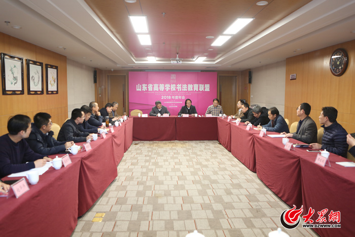 大众网济南11月23日讯(记者 尹延杰 通讯员 王志军)11月19日,由山东省高等学校书法教育联盟主办、山东艺术学院承办的山东省高等学校书法教育联盟2018年度年会在济南召开。中国书协理事、山东省书协常务副主席兼秘书长孟鸿声,山东艺术学院党委书记马东骅、院长王力克,曲阜师范大学书法学院党委书记姜晓强、副院长陈涛、教授朱乐朋、副教授徐传法,临沂大学美术学院书法系副教授房彬、教师张超,山东建筑大学艺术学院副教授谭延祯,齐鲁师范学院美术学院院长李广平,山东工艺美术学院造型艺术学院教师杨国栋,齐鲁理工学院艺术学院院长张胜利、教师赵华伟、李胜伟,山东艺术学院美术学院党总支书记常勇、书法工作室主任于明诠、副教授陈靖、教师贾长庆、杨建虎等出席会议。