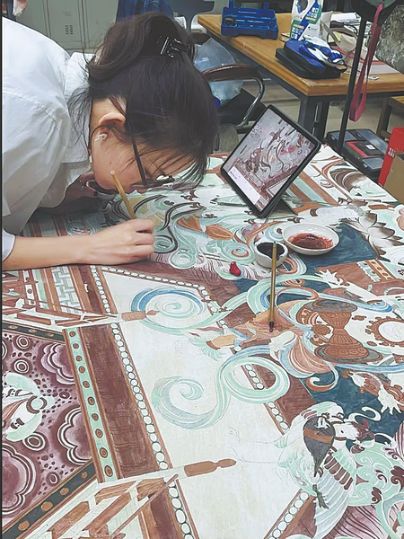 Qin Yueyu, 27, from Anhui province, works in a classroom at Shandong College of Arts in Shandong province. She has brought stunning murals closer to the public with her meticulous reproductions. CHINA DAILY