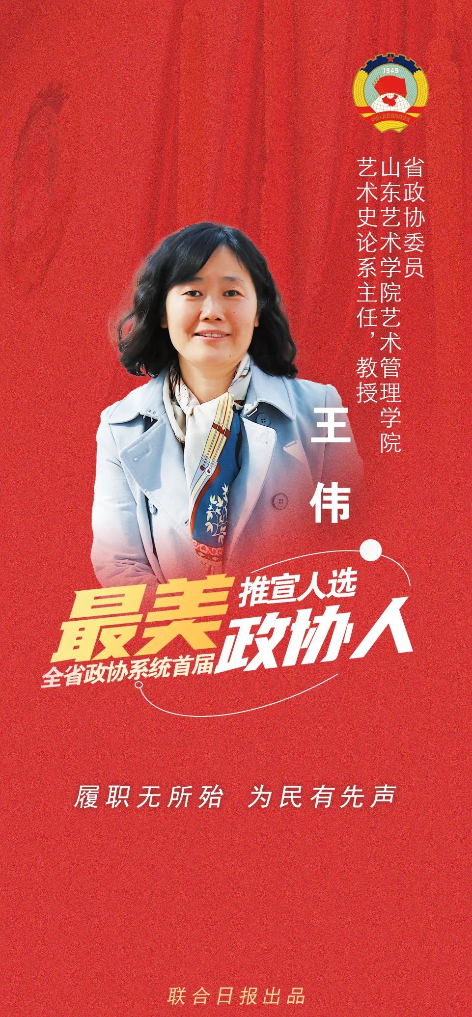 王伟:省政协委员,山东艺术学院艺术管理学院艺术史论系主任,教授、硕士生导师,省级一流专业负责人,民进山东艺术学院支部主委,山东艺术学院欧美同学会副会长,兼任中国艺术学科研究生教育联盟常务理事、山东省比较文学学会理事,入选“山东美育专家”。2021年荣获“山东省教育系统女职工建功立业标兵”称号。