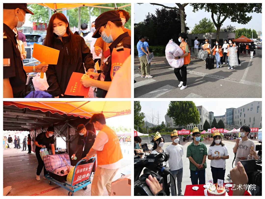创新形式很用心。在今年的迎新中,学校各职能部门和二级学院精心设计、创新形式,迎新现场处处见水平、显心思、有创意,展现了丰富多彩的校园文化和学院特色。大学生记者团为9月8日过生日的5名新同学准备了生日蛋糕,在迎新现场为他们送上了生日祝福,祝贺在生日当天成为最新的“山艺人”。各二级学院以“喜迎二十大 青春心向党”为主题,用“心”迎新、用“新”迎新的举措,将理想信念教育、爱国主义教育、爱校荣校教育融入迎新环节。戏剧学院为新生发放印制有学院logo的定制口罩,从入校之初就增强了大家的归属感;现代音乐学院为新生准备了一场现场迎新“音乐会”,让新生在音乐的饕餮盛宴中开启大学新征程;设计学院为每名新生准备了院标钥匙扣、在教学楼前陈列了院史墙,增强了大家对学校和学院的自豪感;舞蹈学院为年龄最小的新生赠送了迎新礼物,为过生日的新生赠送院服,让大家感受到学院老师、同学们的热情和爱护;传媒学院开通抖音直播,为因疫情管控需要无法送孩子进入校园的家长们提供了第一时间直击现场的平台;电影学院发挥学生专业优势,全方位跟踪拍摄迎新各个环节,不仅记录下新生入学的点点滴滴,更将专业学习与实践相融合;书法学院在新生入校后,由老生带领参观校园,为新同学讲解学校的点点滴滴,让大家更快地融入新家庭;国交学院为新生精心准备了小礼品,用鲜花表达着对新生即将踏上新征程的美好祝福;音乐、戏曲等多个学院都准备了签名墙、打卡墙,用心记录下新生们在山艺校园的第一个精彩亮相。