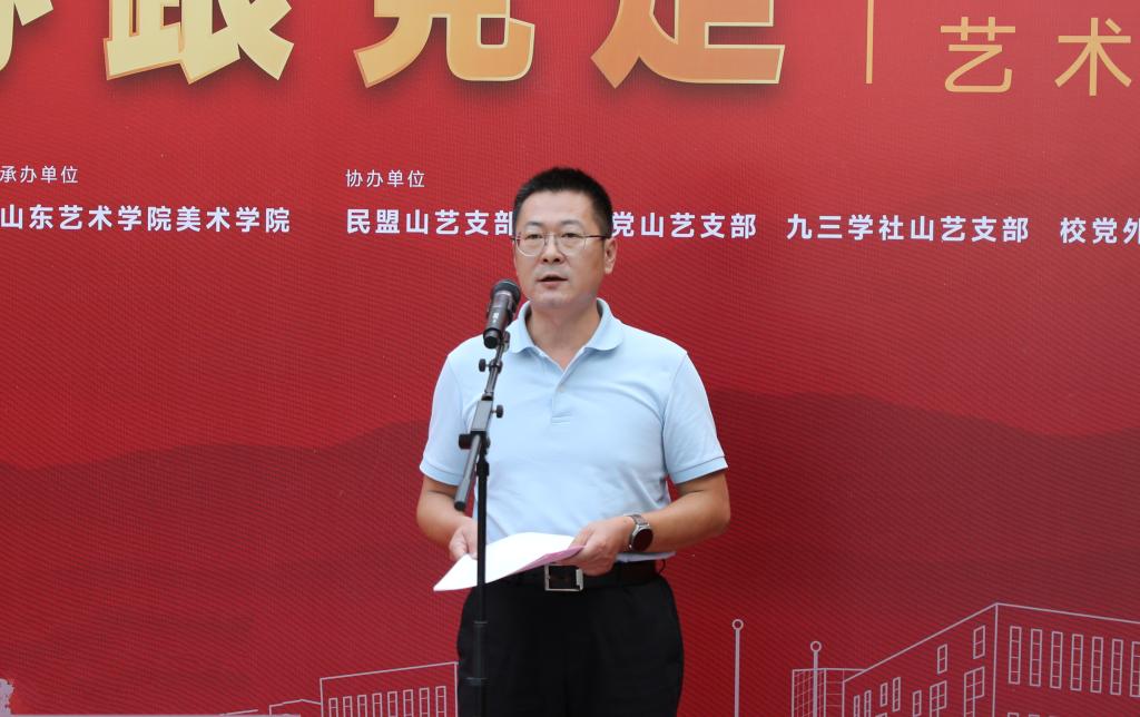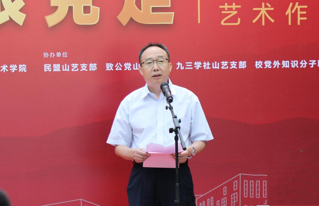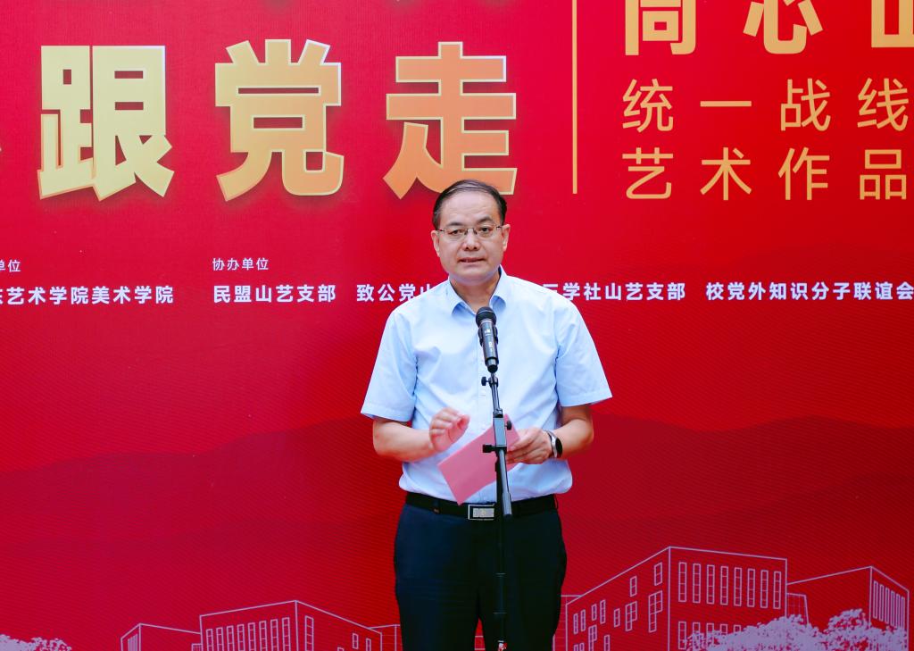 王洪禹代表学校党委向展览的顺利召开表示热烈的祝贺,向各位来宾的到来表示热烈的欢迎。他指出,此次艺术作品展是学校统一战线喜迎党的二十大、庆祝党的统一战线政策提出100周年的深情献礼!学校党委始终高度重视统一战线工作,促进“党建+业务”深度融合,引导全校统战成员始终做到与党同心同向同行。他希望全体统战成员要在“围绕中心、服务大局”工作中,奋力走在前、当标杆、做示范,持续打造“同心山艺”品牌,促进学校各项事业高质量发展,响应“走在前,开新局”强省建设新号召,为建设现代化高水平艺术大学谱写新辉煌,以优异成绩迎接党的二十大胜利召开!