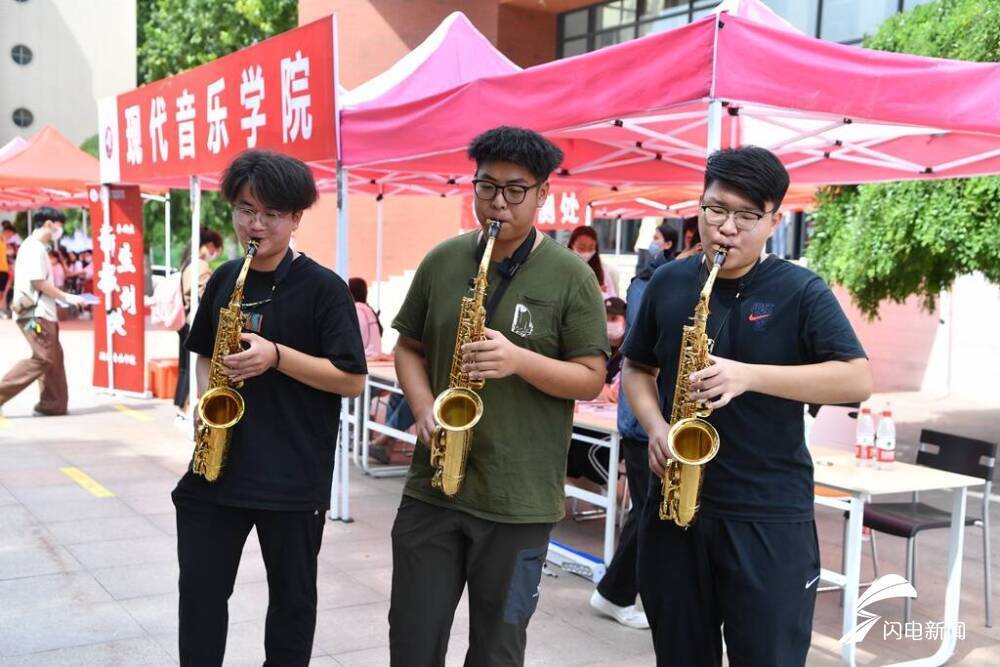 来自济南的张宇星和河南焦作的赵芫是山东艺术学院流行音乐专业校考专业课成绩的省内第一和省外第一,两人与同学一起在广场上演奏起萨克斯,让不少学生驻足欣赏。